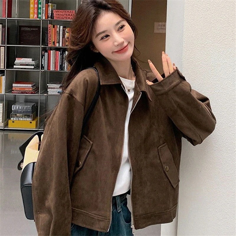 小柄向けショートジャケット アメリカンレトロ アウター秋服 新品掲載!キャラメル色メラド風スエード風ジャケット 2026秋新作