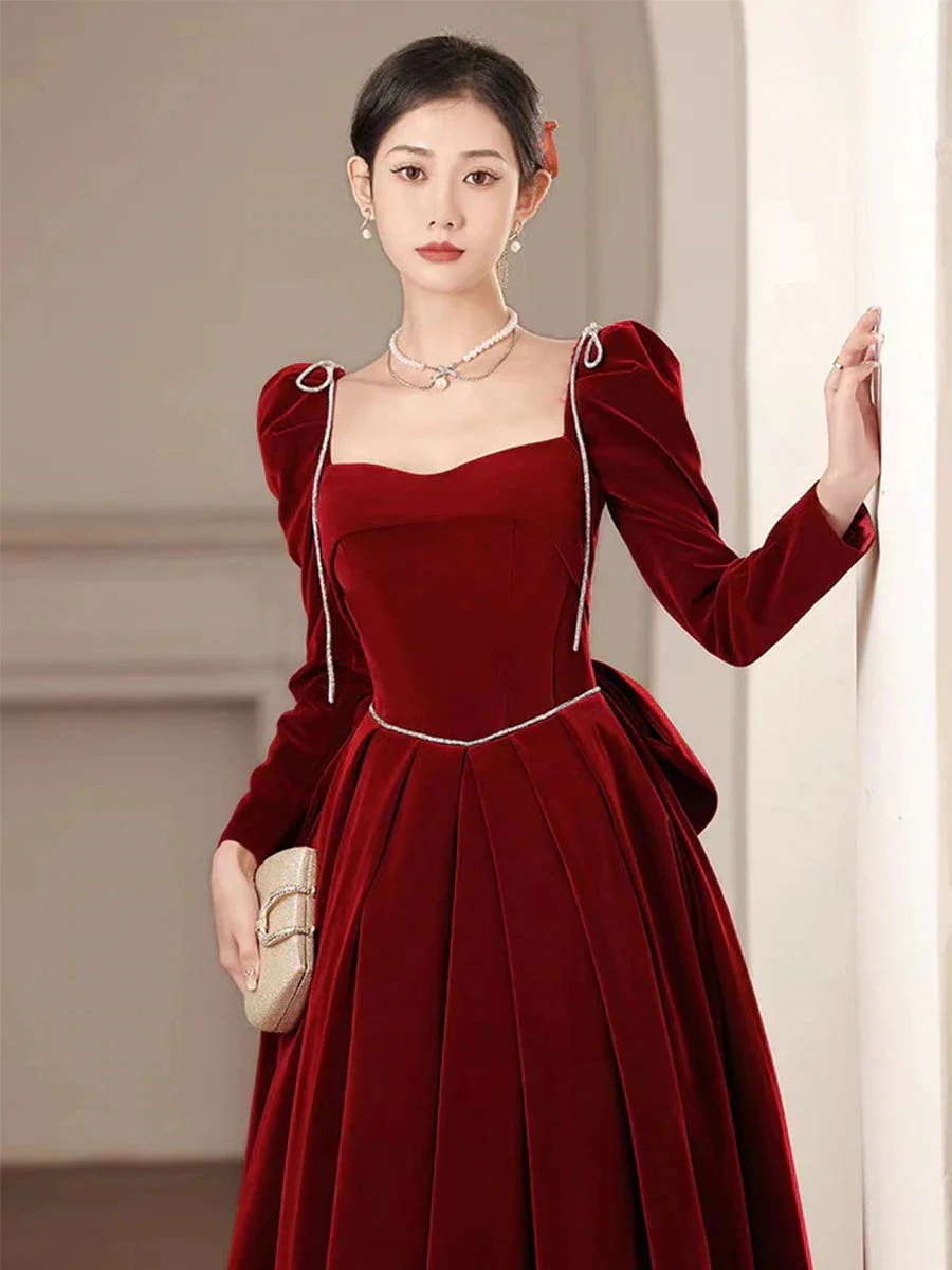 2025 秋冬 赤ドレス ワンピース レッドドレス 暖かい 新作 長袖 ロングワンピース パーティードレス レディース
