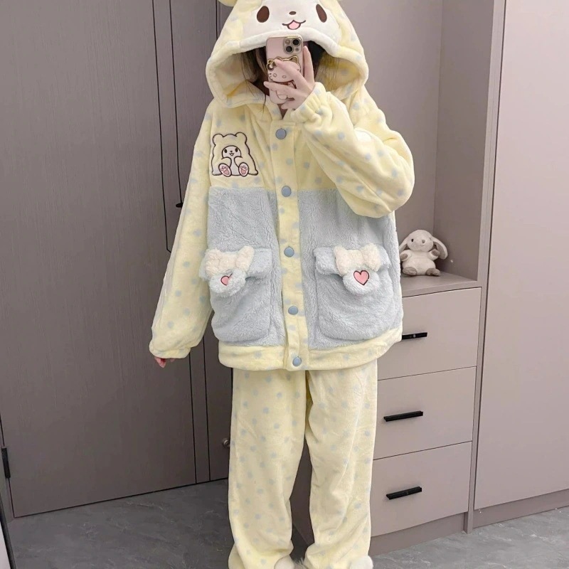 2 点目から送 料 無 料あったかウェア もこもこパジャマ 可愛い クマのフード付きフランネル厚く暖かいかわいい女の子ソフト女の子サンゴフリースパジャマ部屋着