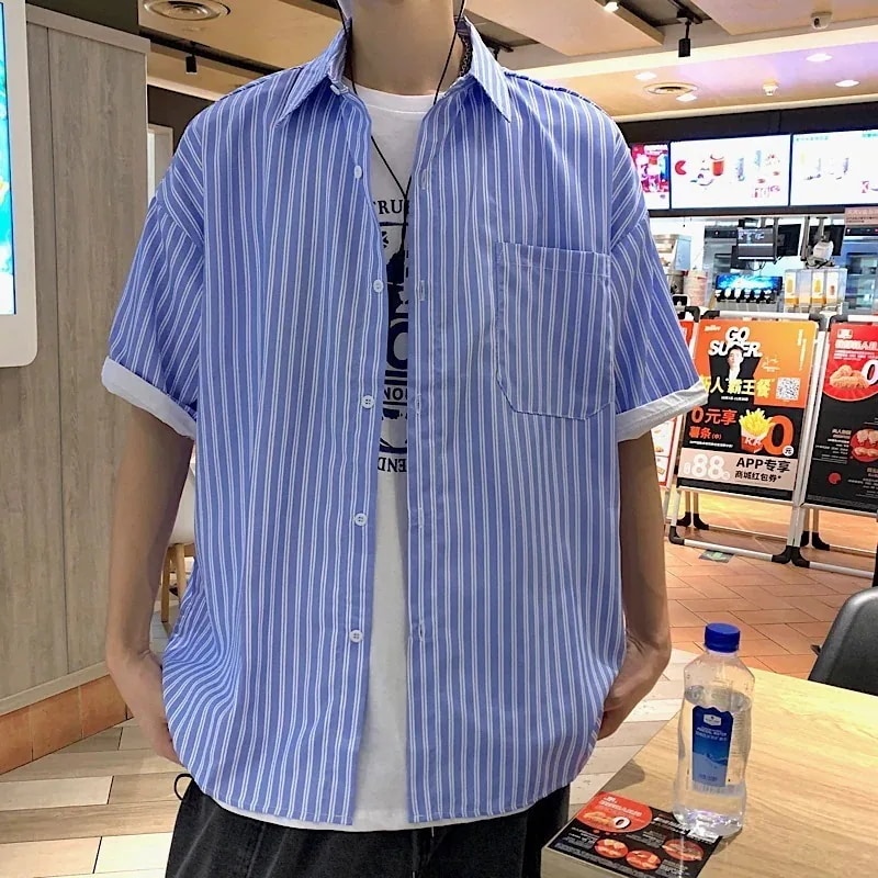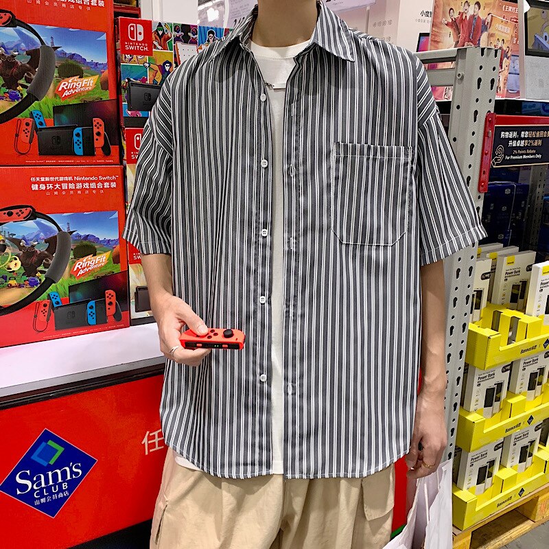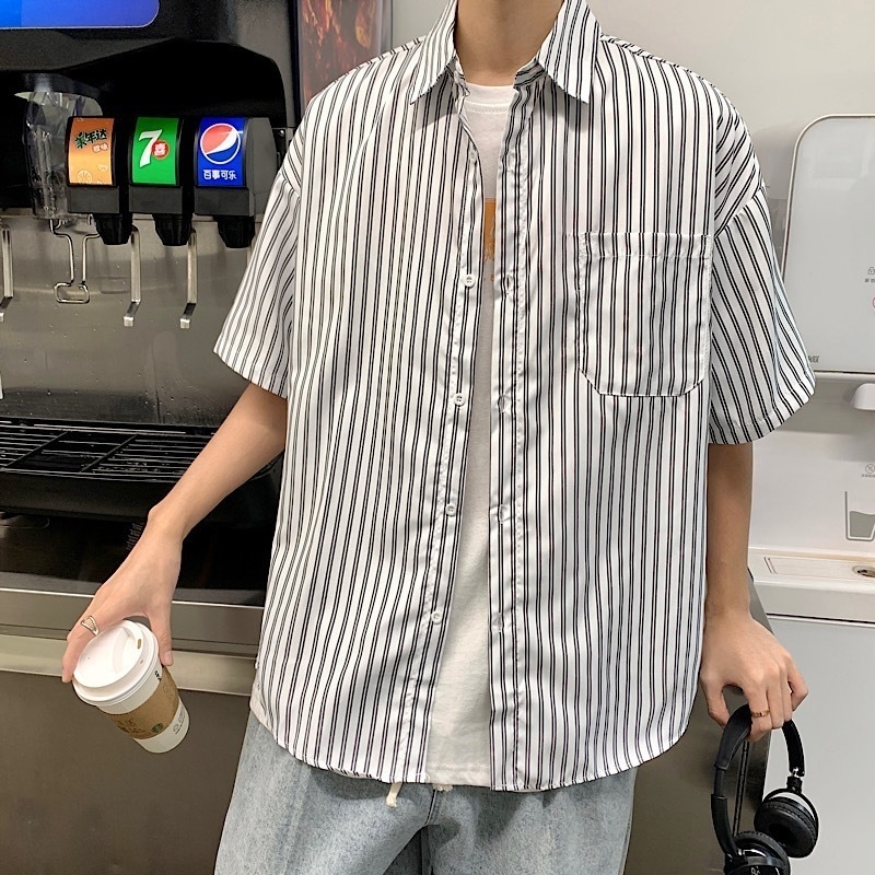 2 点目から送 料 無 料シンプルなストライプのシャツメンズ半袖タイドブランドトレンドインのの薄いルーズな5分の1袖シャ