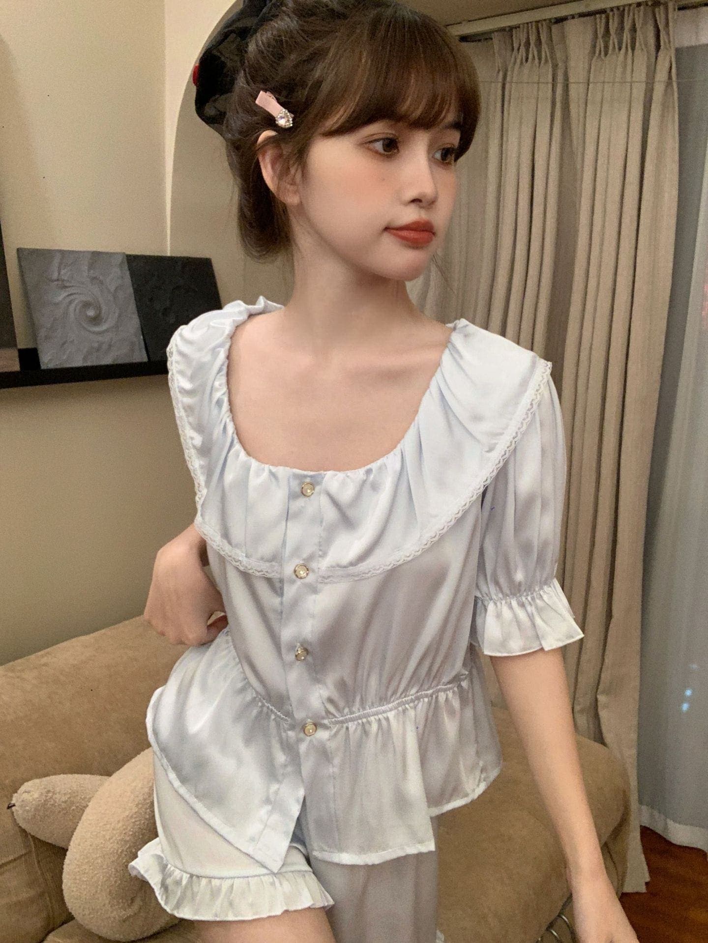 ウェア パジャマ 部屋着 寝間着 涼しいパジャマ ホームウェアレトロパジャマのの半袖ショートパンツパジャマアイスシルク10代の女の子のセット 韓国ファッション