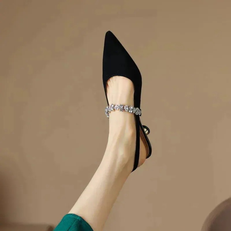 スタイルアップヒールパンプス 韓国ファッション サンダル スリムラインストーンシルバーとんがりつま先バック中空小さな革の靴ハイヒール包頭サンダル女性