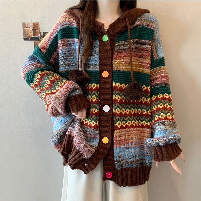 レディース ヴィンテージ ぶつかって色 しま模様 フード付き ニット 新しい 着痩せ 流行り セーター