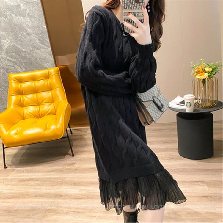 ミディ丈レースパッチワークニットワンピース 2025年秋新作 韓国風無地ツイストネックニットトップス オーバーサイズロング丈・長袖