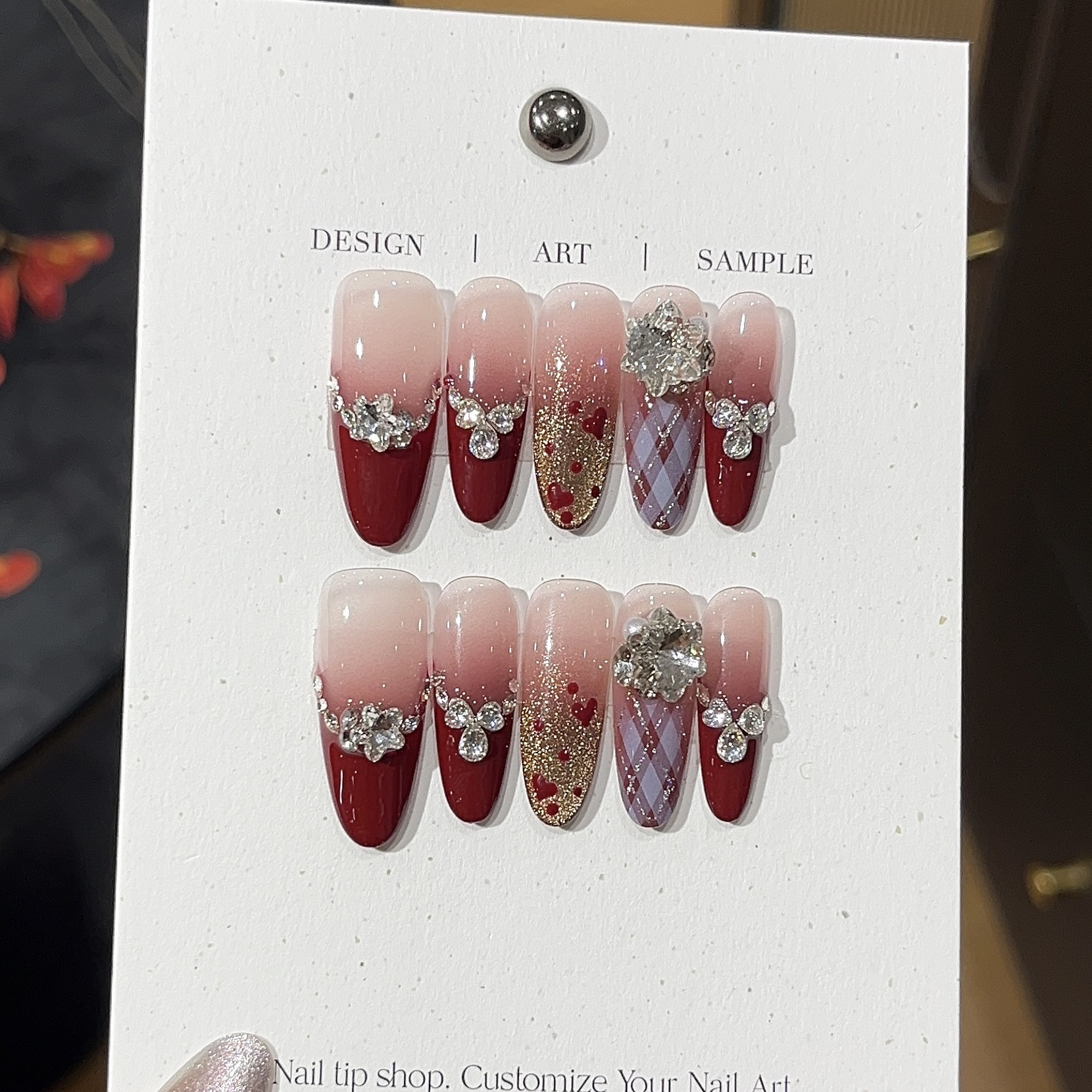 【スウェードレッドチョコ】桃汐里(ももしおり) 雰囲気満点美白 ワインレッドフレンチ ハート水玉柄スノーフレーク ストーンスタック ウェアラブルネイル