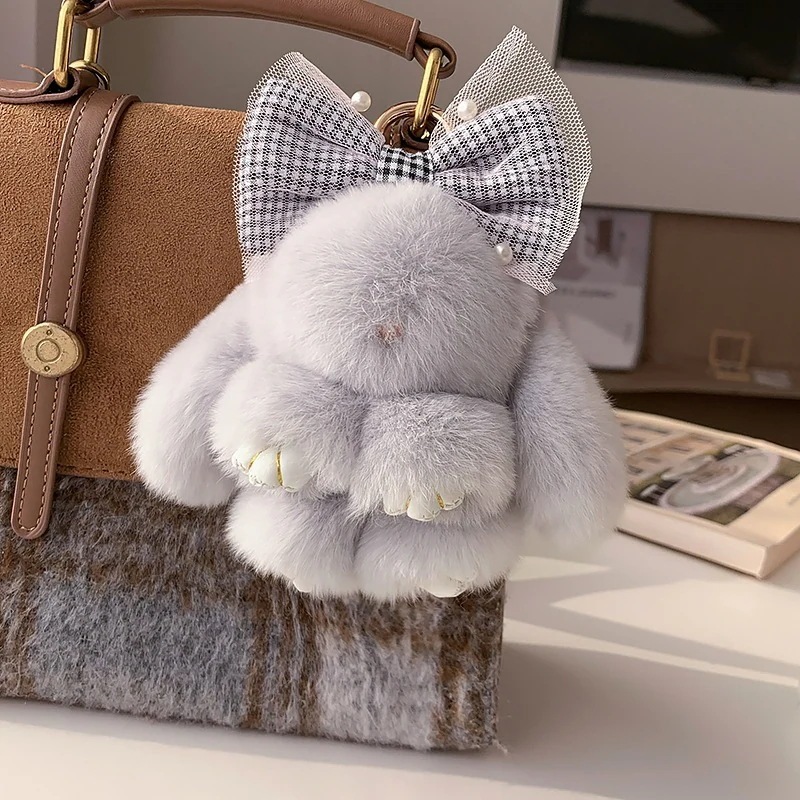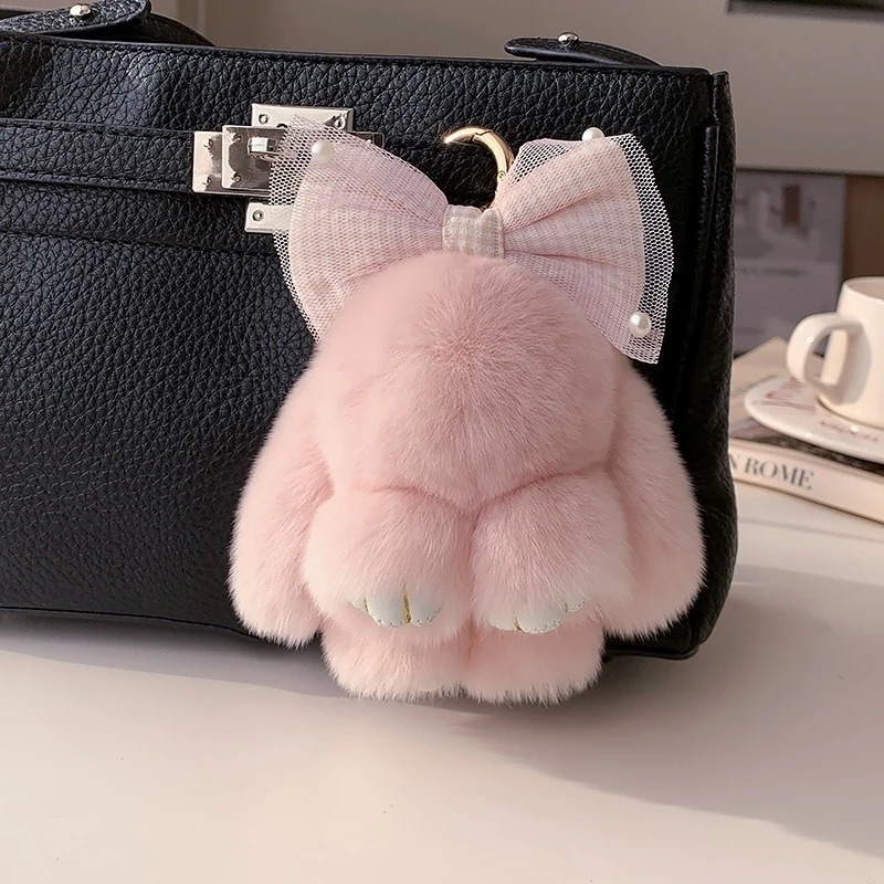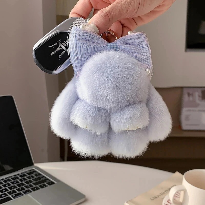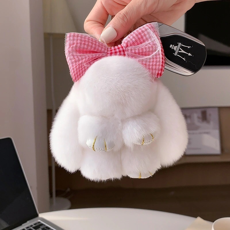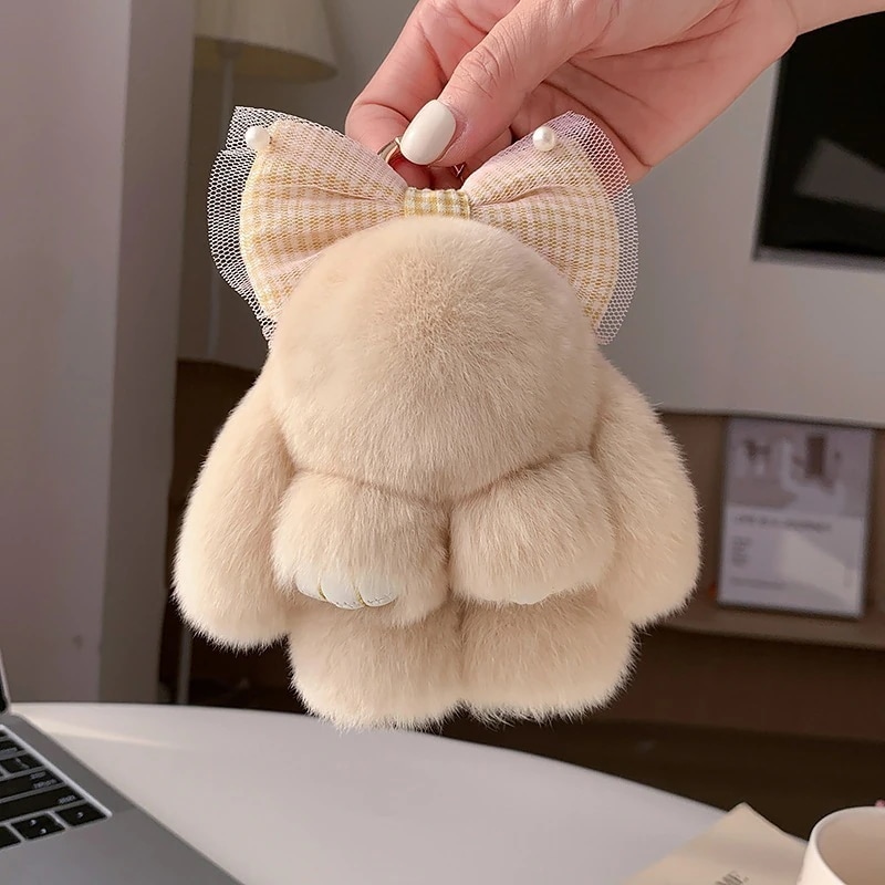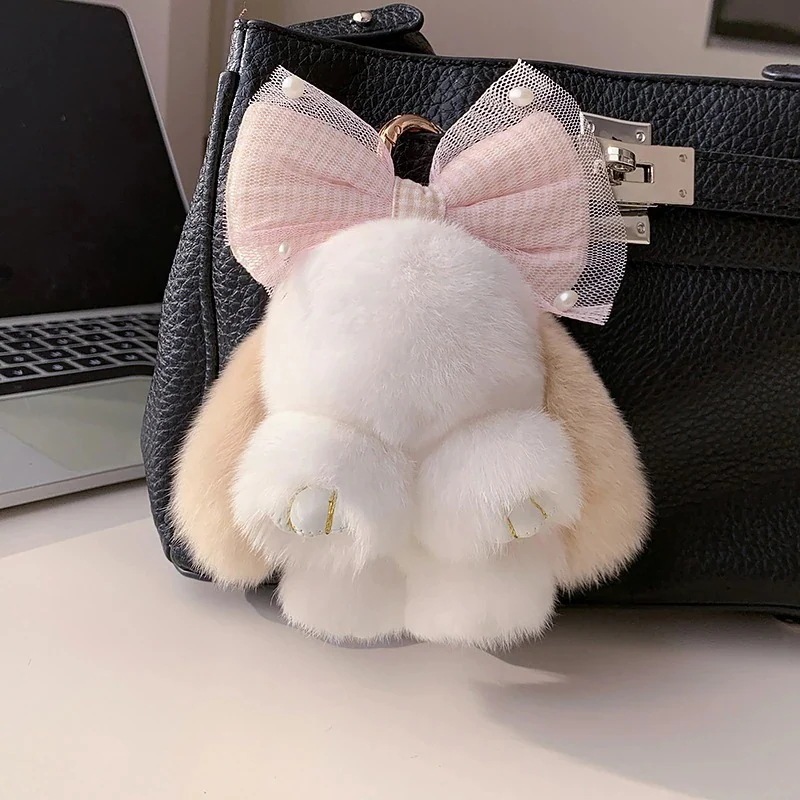 タヌキウサギの毛のリボン付きキュートなウサギのキーホルダーふわふわ垂れ耳ウサギのぬいぐるみバッグチャーム