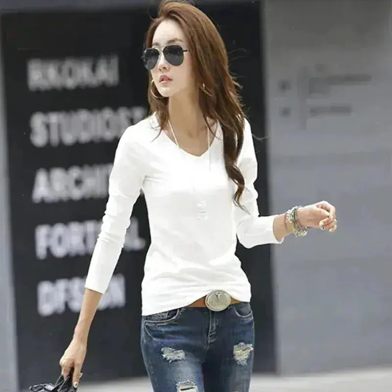 レディース 韓国風 ゆったり カジュアル ボトムス シャツ Vネック コットン 長袖 Tシャツ