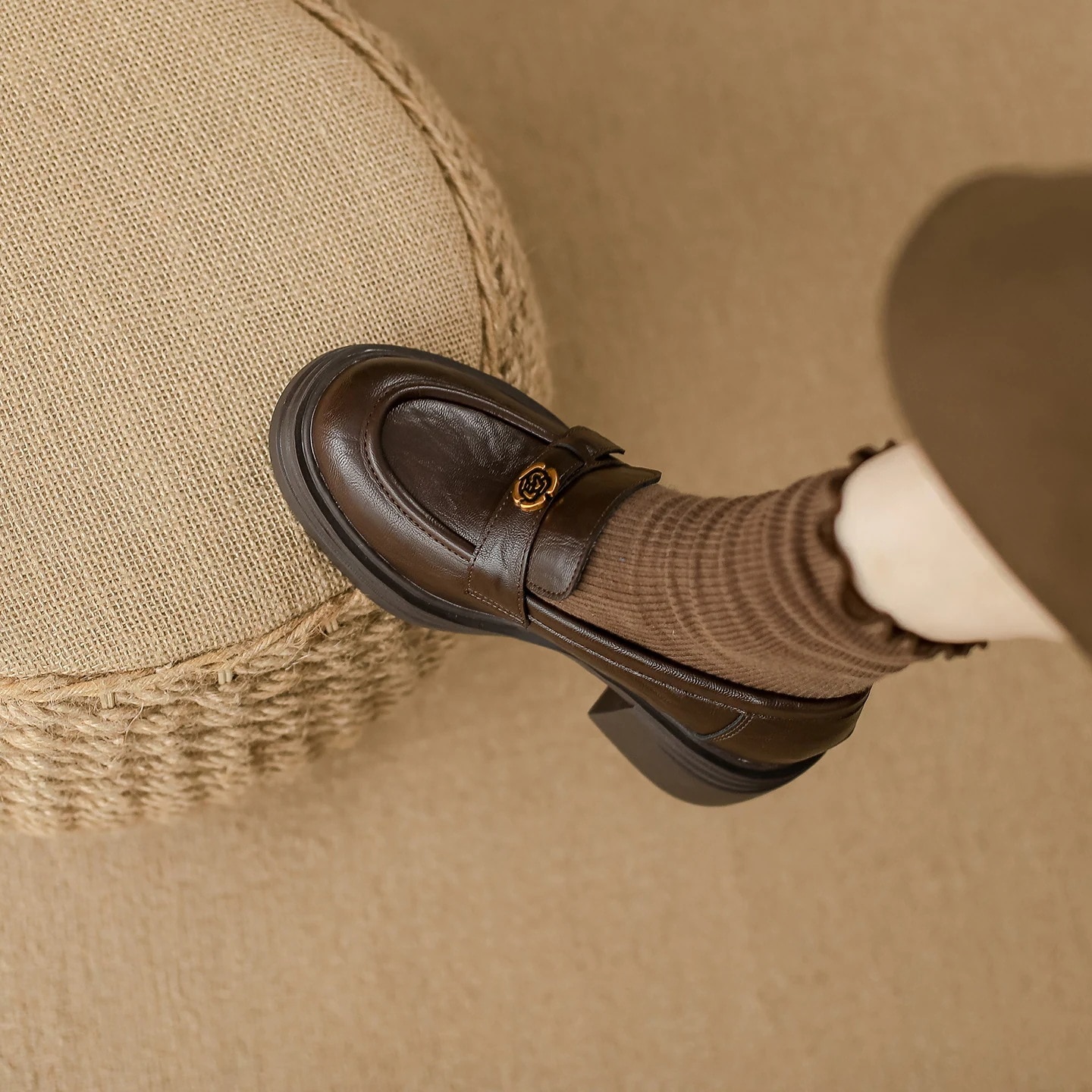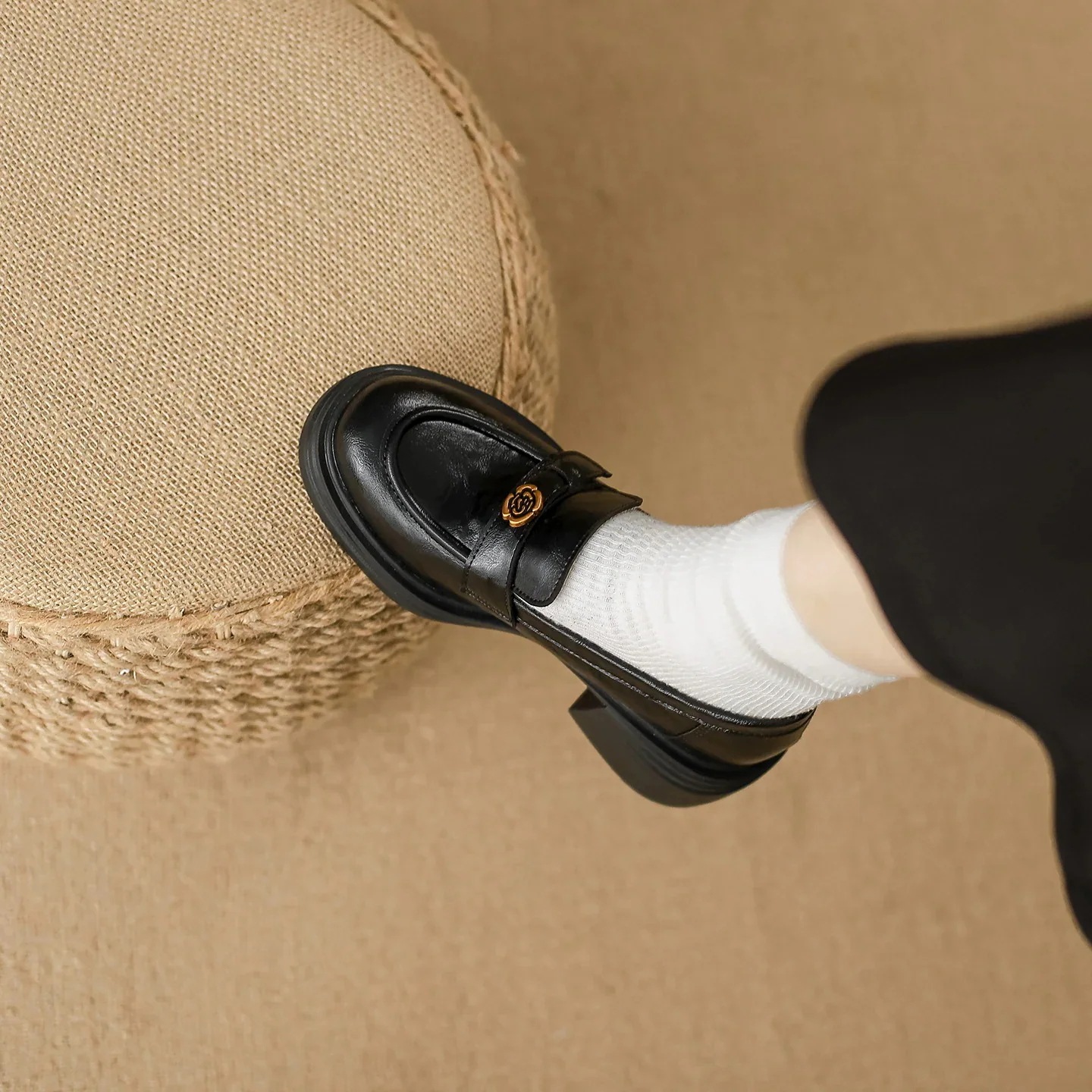 ローファー レディース真皮乐福鞋 イギリス复古厚底粗跟 山茶花アクセント 通勤・ワーク兼用 ブラック百搭 足元リフト 舒適履き