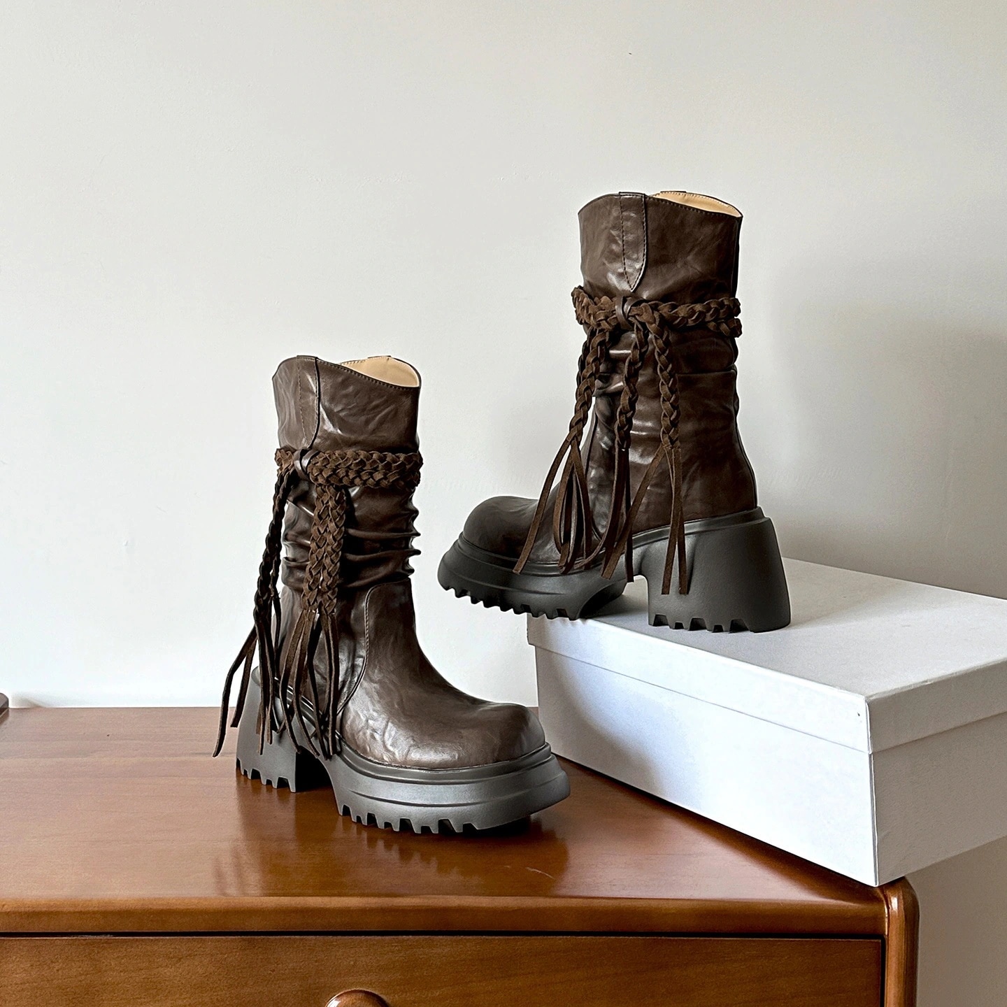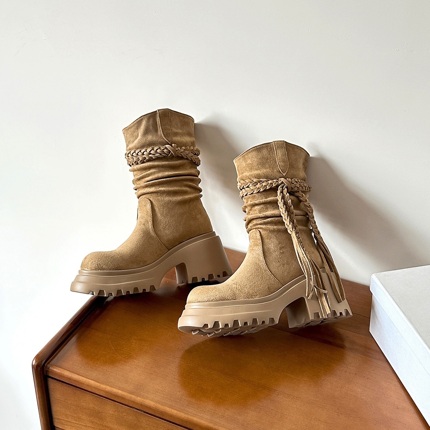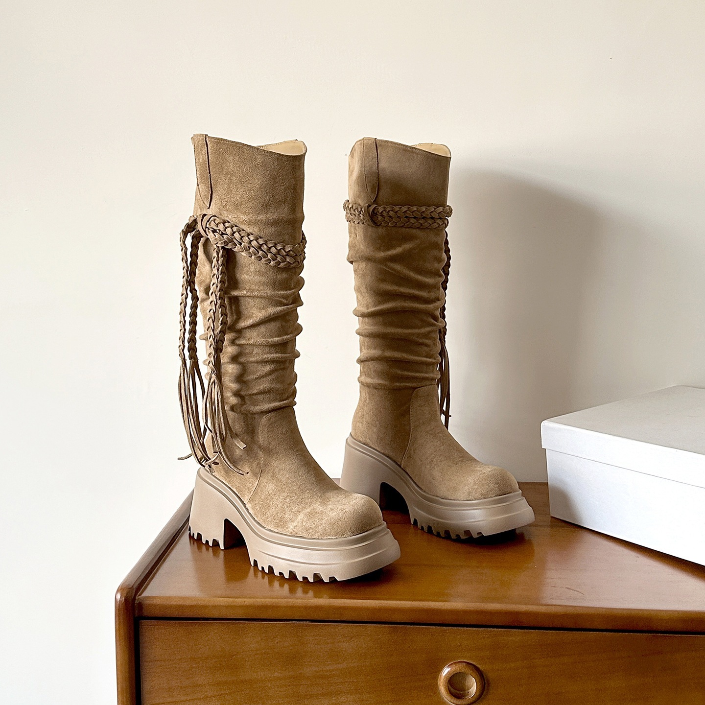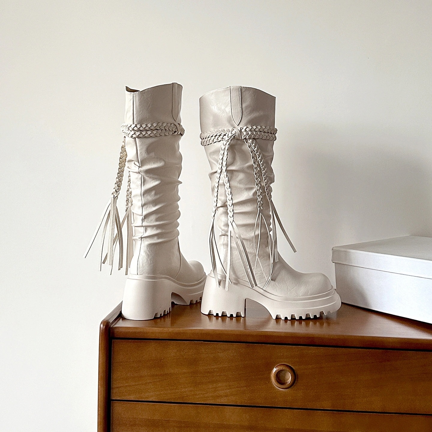 【人気のブーツを厳選】レディース フリンジ 太ももヒール ミドルカットブーツ ウエスタンブーツ 2026 新作 トラベル向け スリム効果 シワデザイン スタックドブーツ ロングブーツ 韓国ファッション