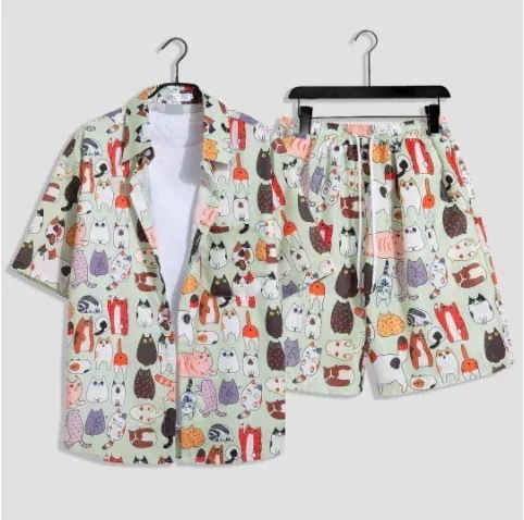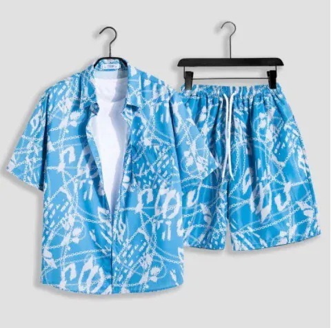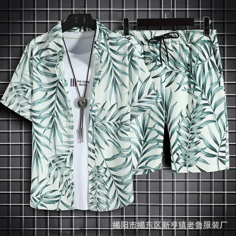 サマー メンズ ビーチ シャツ スーツ ルーズ カジュアル プリント ビーチパンツ ハワイアン ショートパンツ シャツ2点セット