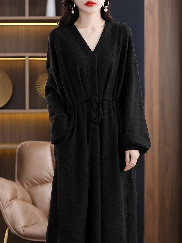 ワンピース 女性の襟付き 単色 大きめサイズ ベースレイヤー シンプル 長袖 セーター 韓国風 ゆったり ハーフ丈 ニットスカート ロング丈・長袖