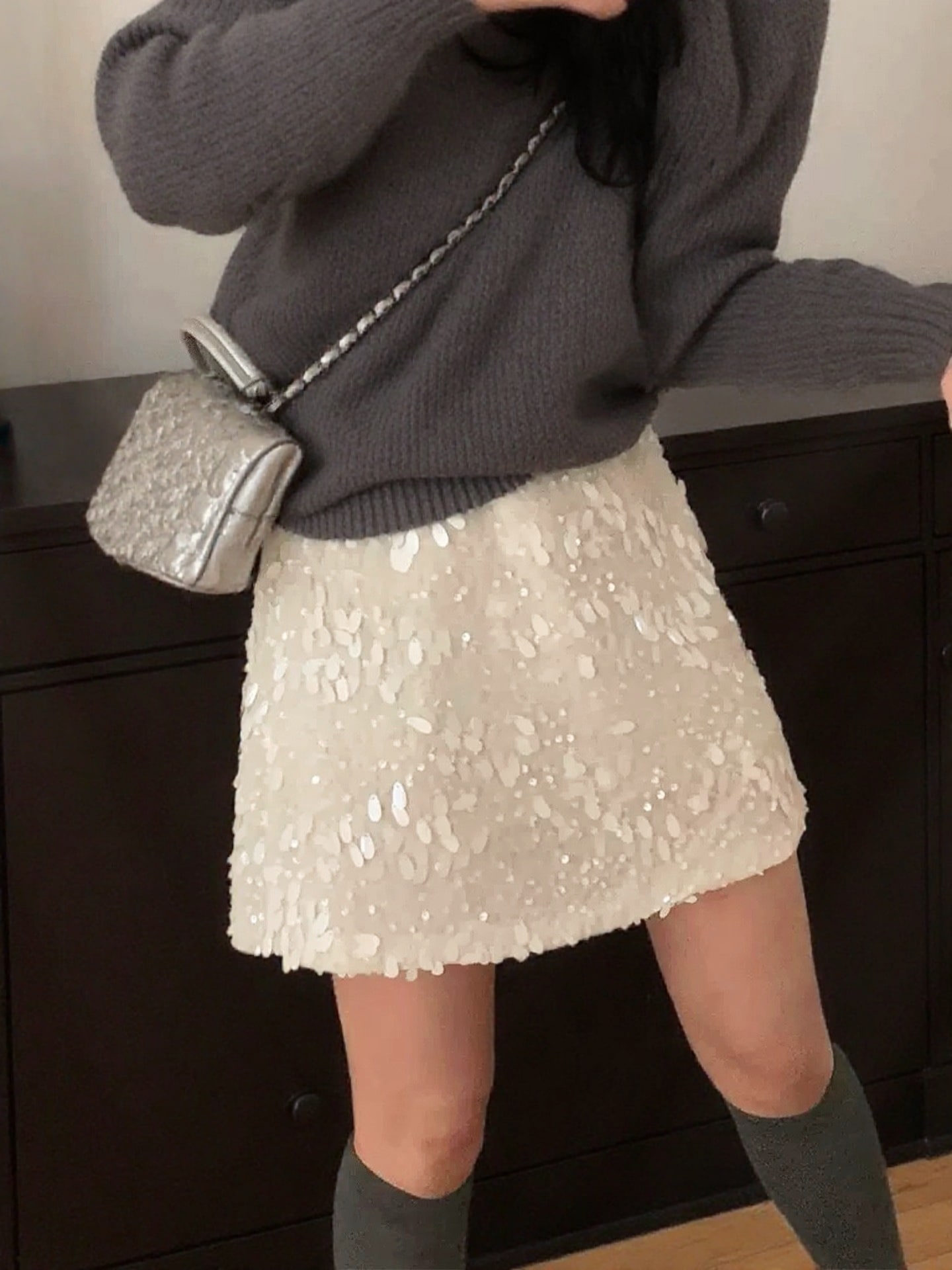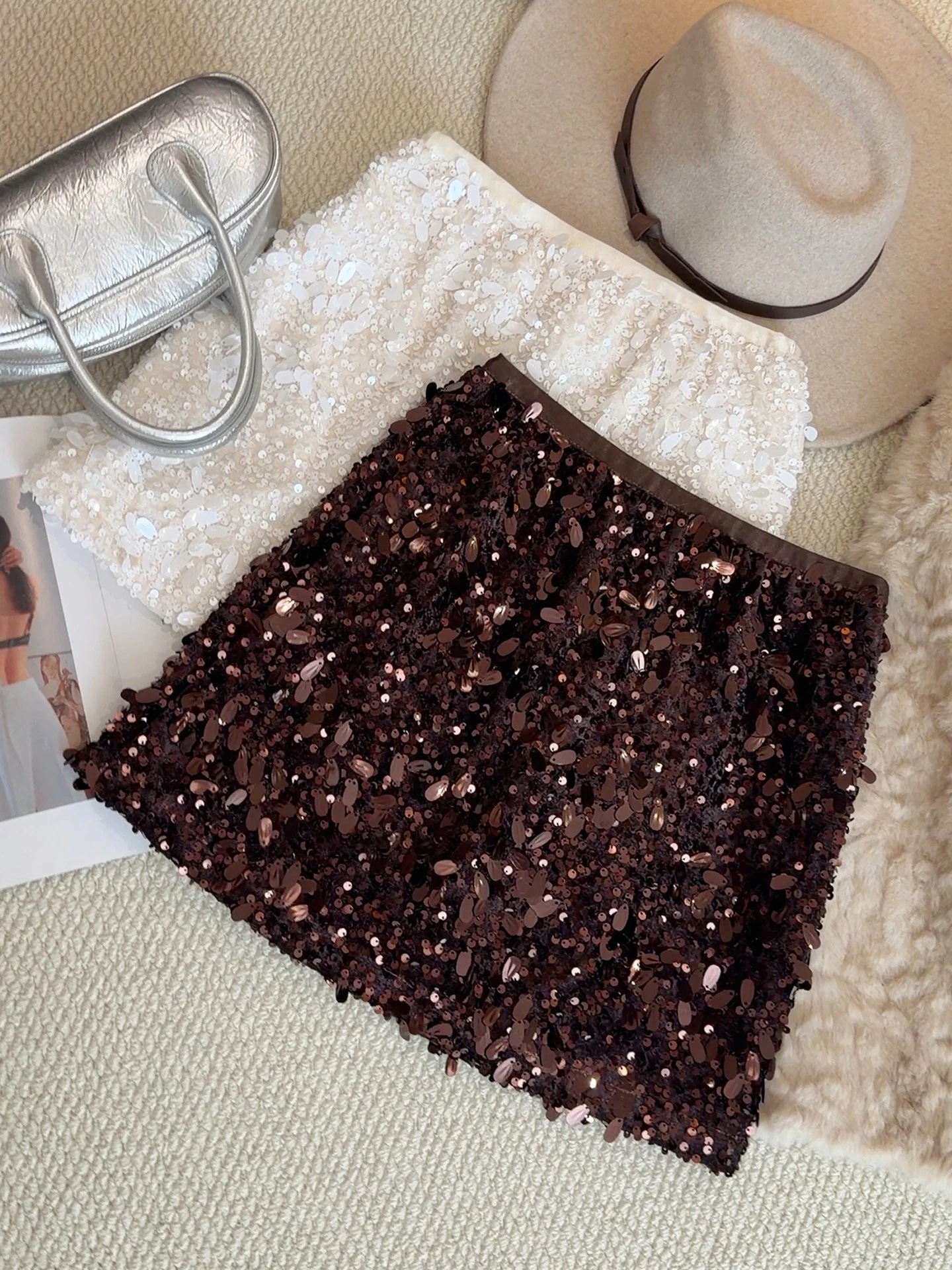 ファッション シックなブラック ゴージャスなスパンコールミニスカート 女性 2025年秋冬モデル ハイウエストで細身効果 Aラインフィットスカート