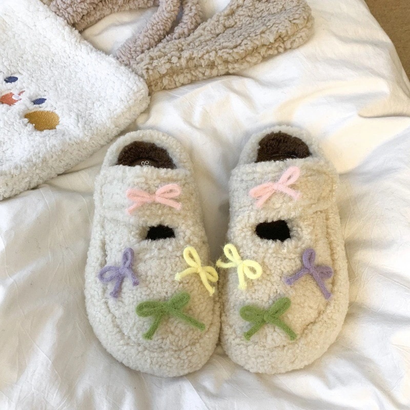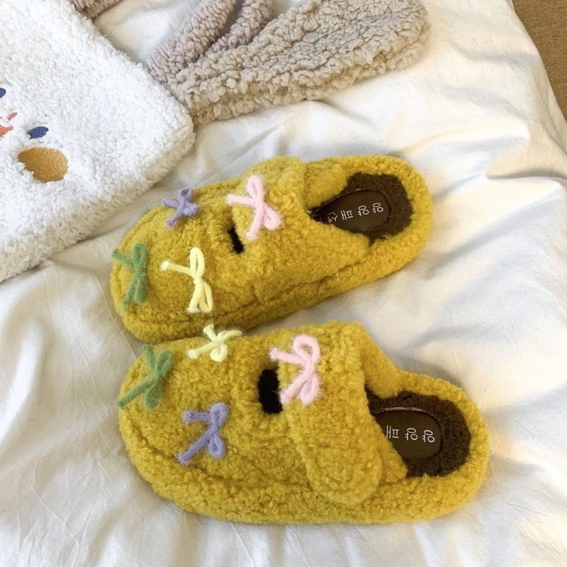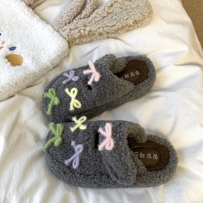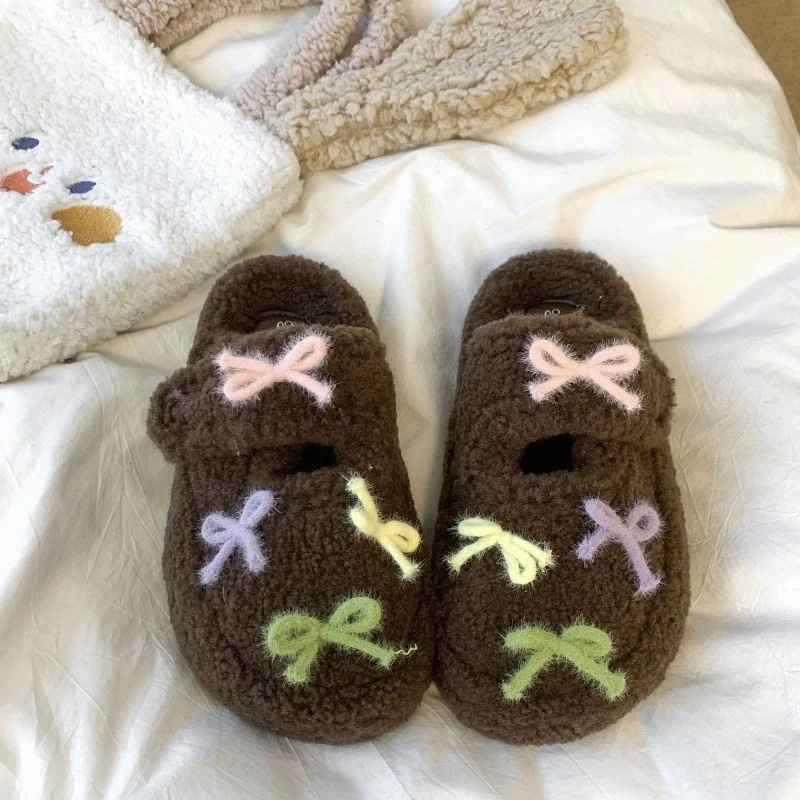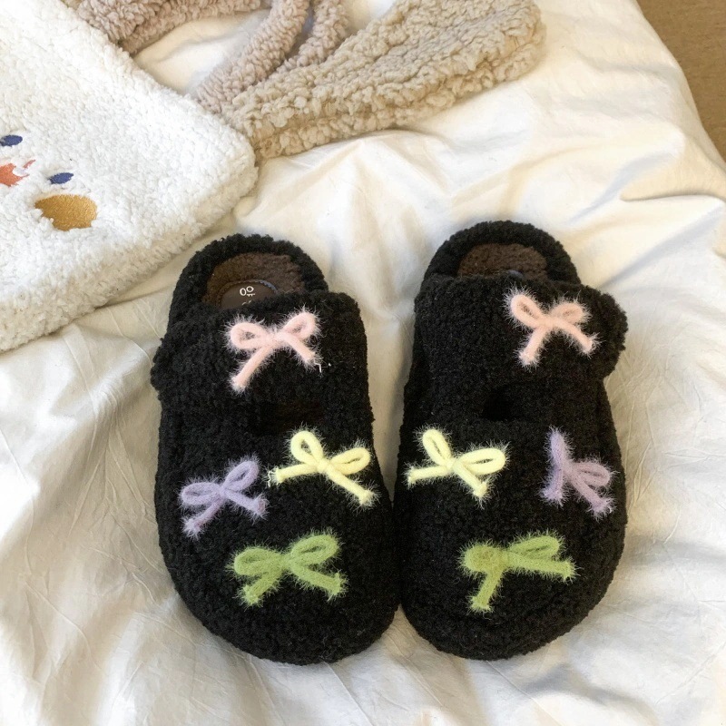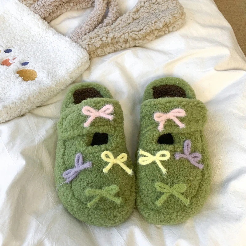 最安値挑戦【3日出荷】秋冬 レディース リボンフリースシューズ 厚底保温 つま先カバー 外出用 スリッパ
