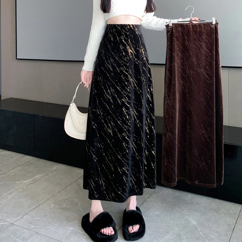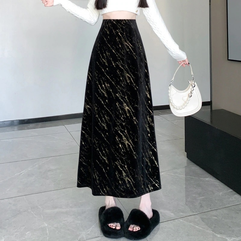 超目玉セール【3日出荷】ゴールドベロアハイウエスト 秋冬フレアロング A ラインパラソル スカート