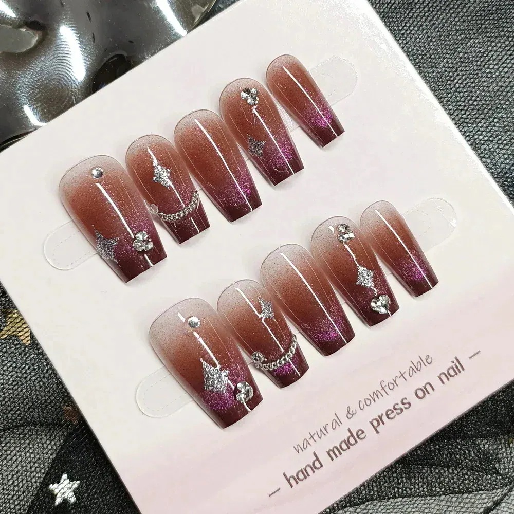 最低価格保証!ワインレッドクリスタルキャッツアイウェアラブルネイルチップ シルバーのスターバーストハンドメイドのウェアラブルネイルアートをスタンピングするチェーン10ピース