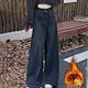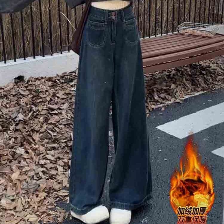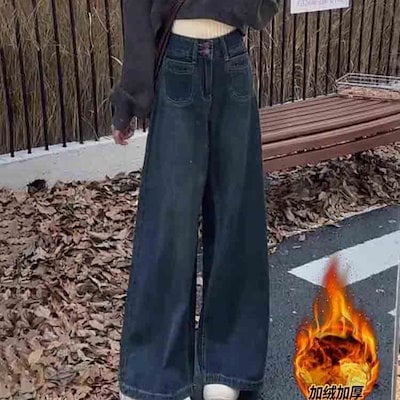 店長おすすめ【3日出荷】冬 レディースフリース入り加厚ハイウエストルーズワイドレッグジーンズ ストレートドラッグパンツ 暖かパンツ