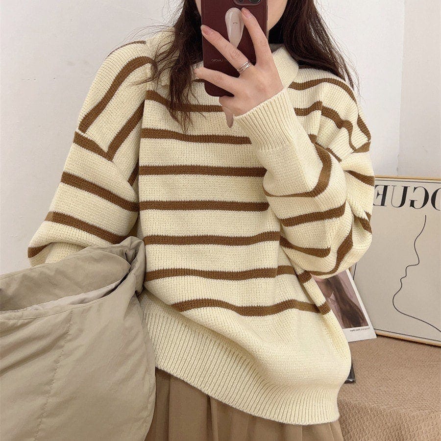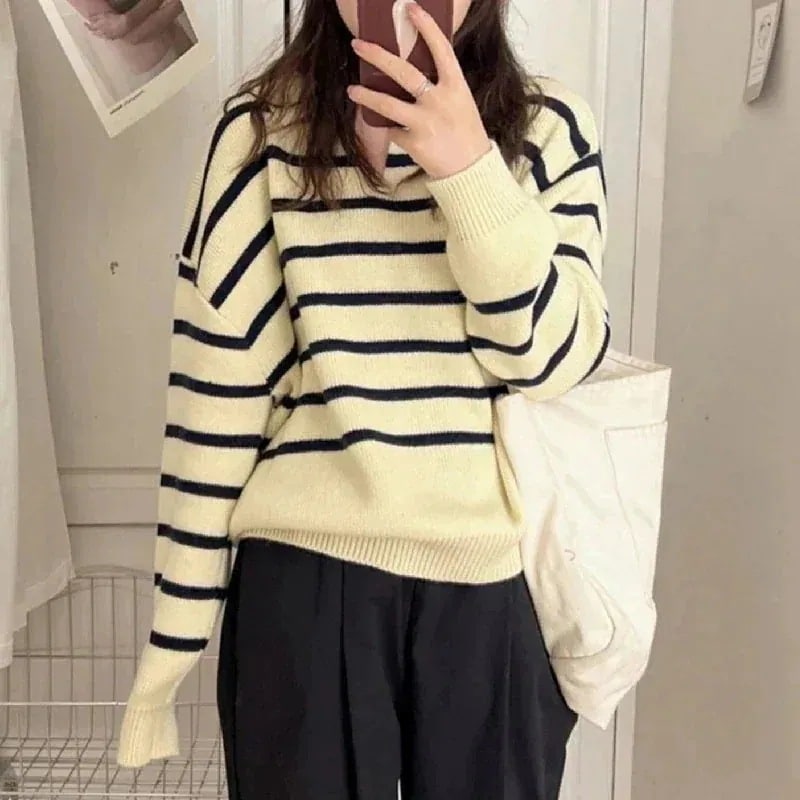 数量限定ニットセーター リブニット 韓国ファッション レディース カシミヤタッチ 長袖 ストライプ ゆったり シンプル ベーシック 人気 おしゃれ