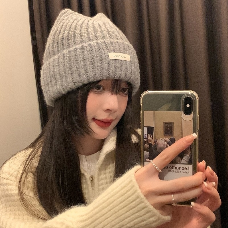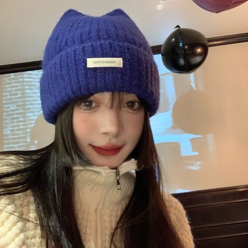 今すぐ購入ニット帽子 かわいい 猫耳ウールキャップ女性カジュアル文字パッチニットキャップ暖かいプルオーバー防寒キャップ