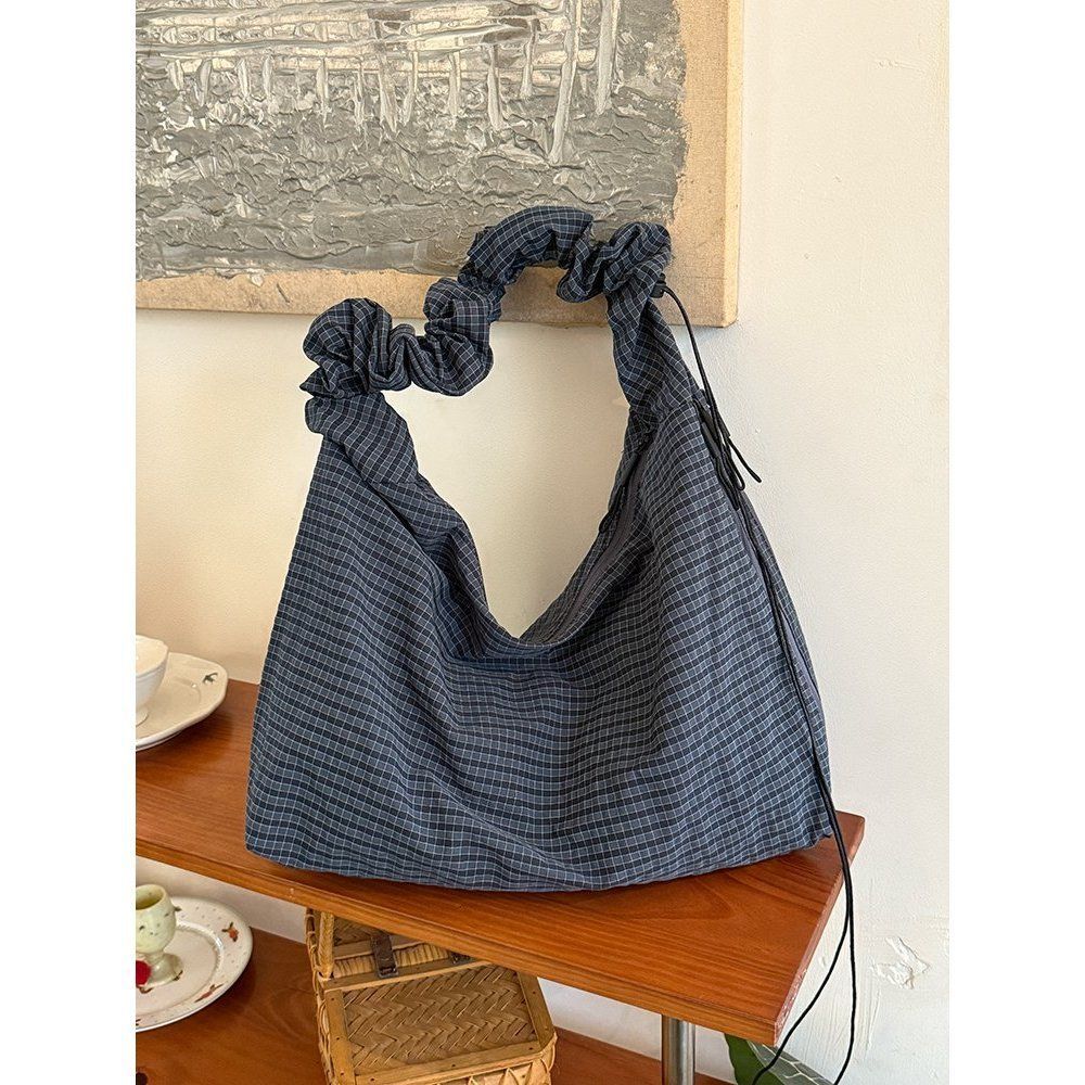 トートバッグ 韓国風レトロチェックキャンバスバッグ 新作大容量ドローストリングトートバッグ 通勤ショルダーバッグ