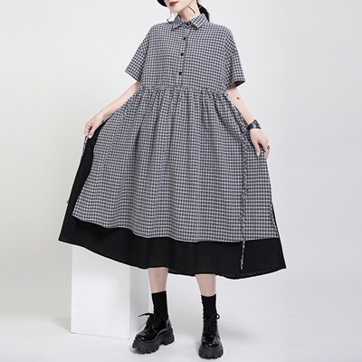 涼しげシャツワンピースチェック柄はぎ合わせアシンメトリーデザインフェイクレイヤードLFZ74