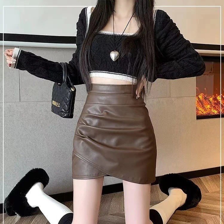 不規則PUレザースカート 2025新作ハイウエストプリーツミニスカート 細身効果 気品ある秋冬Aラインボディコンミニスカート