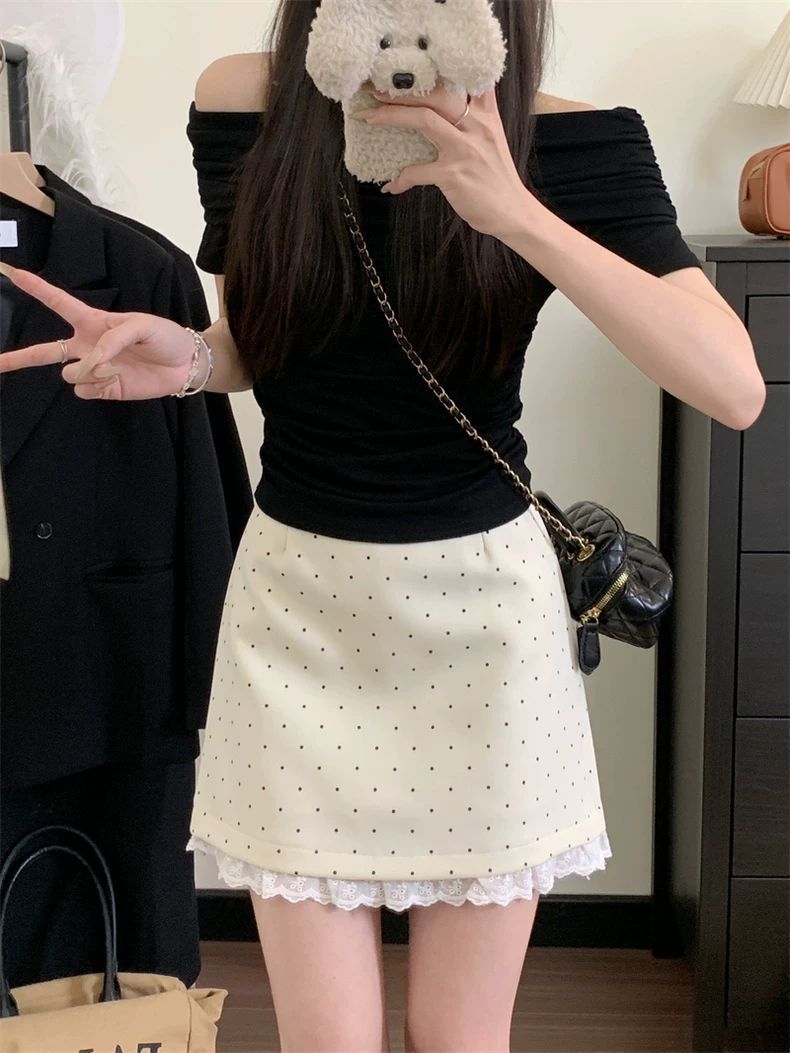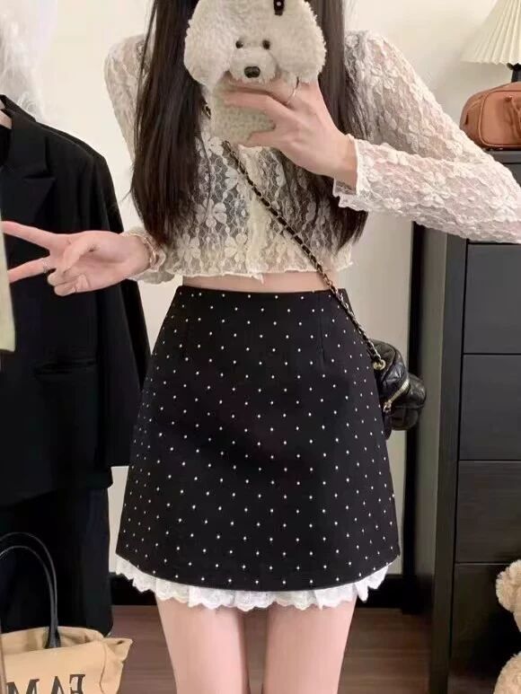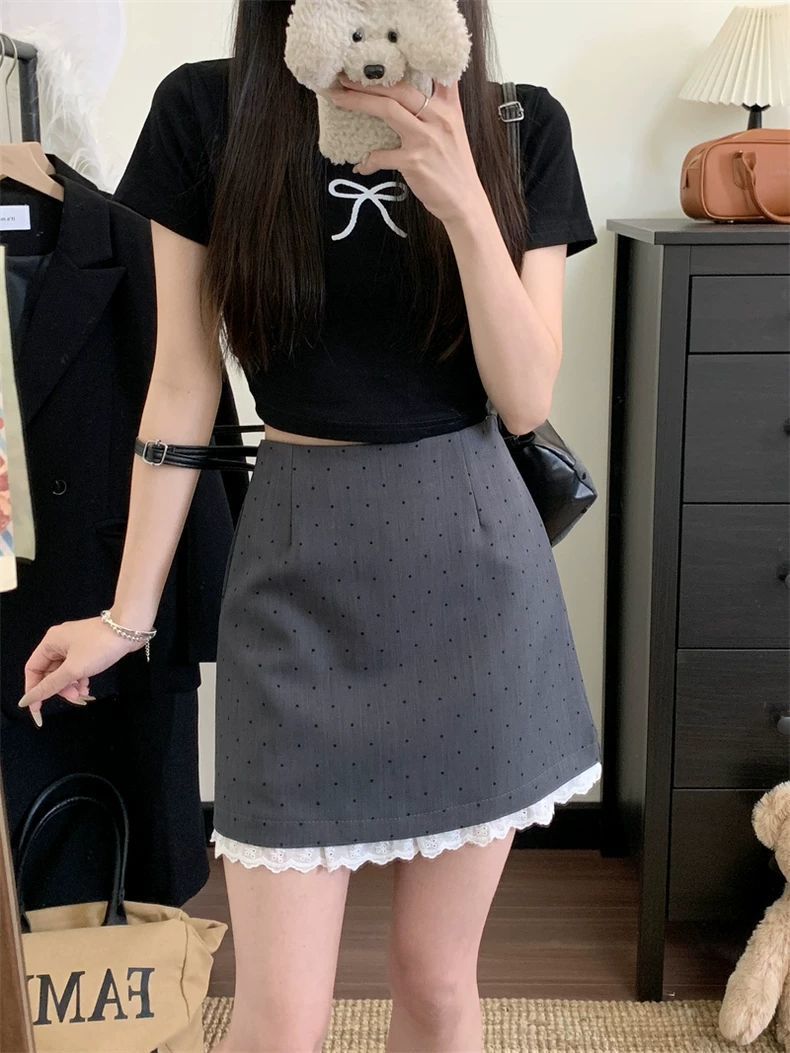 レース縁取りドット柄スカート 夏用小柄に似合う万能スタイル流行ハイウエストAラインフィットミニスカート