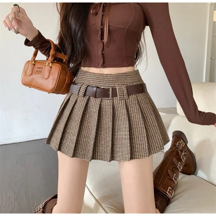 レトロなスクールスタイルの千鳥格子プリーツスカート 秋冬新作 小柄な方におすすめのローウエスト・透け防止Aラインミニスカート