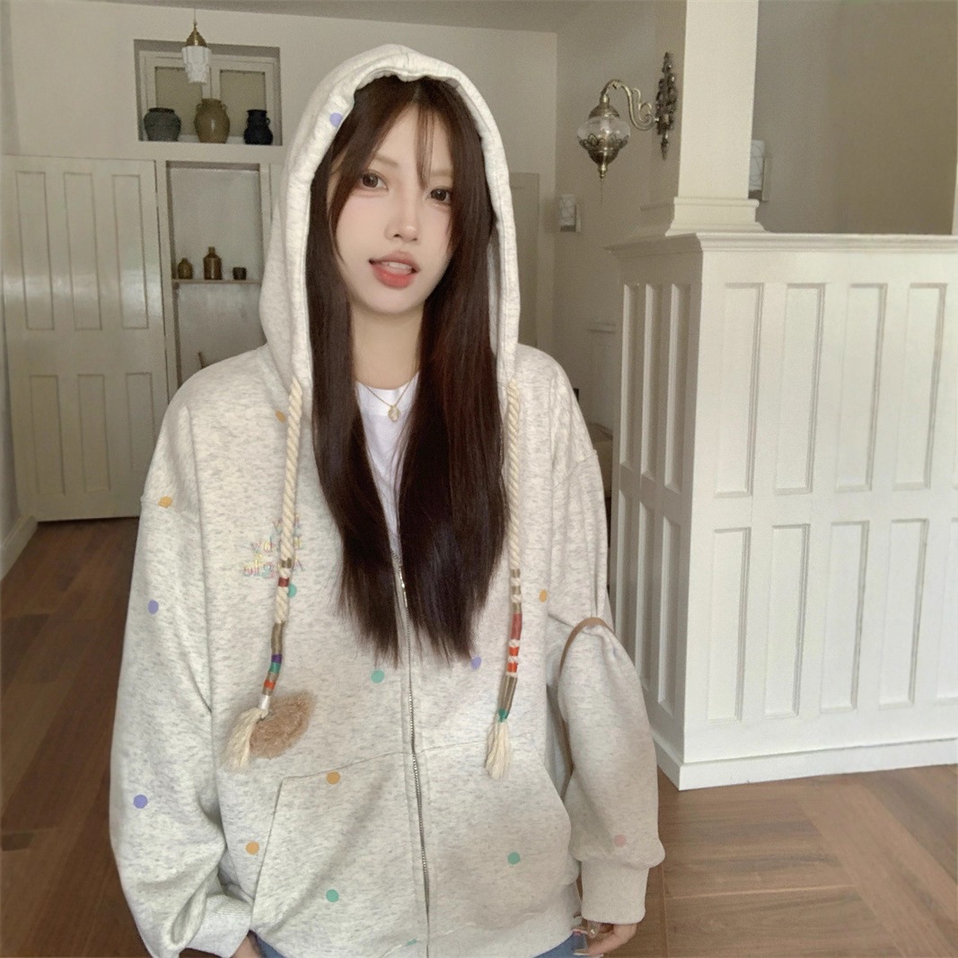韓国風グレーフード付きジップアップスウェットカーディガン女性秋冬フリース裏地付きゆったりカジュアルジャケット