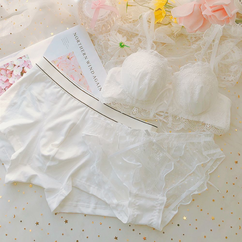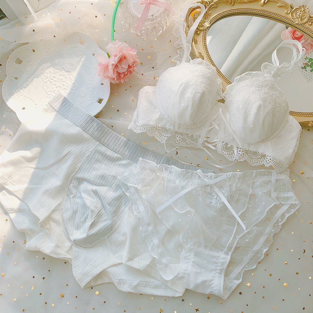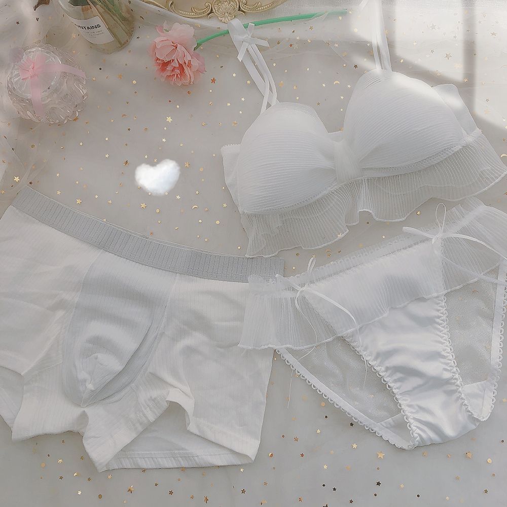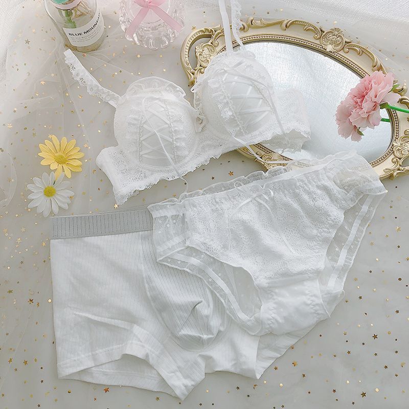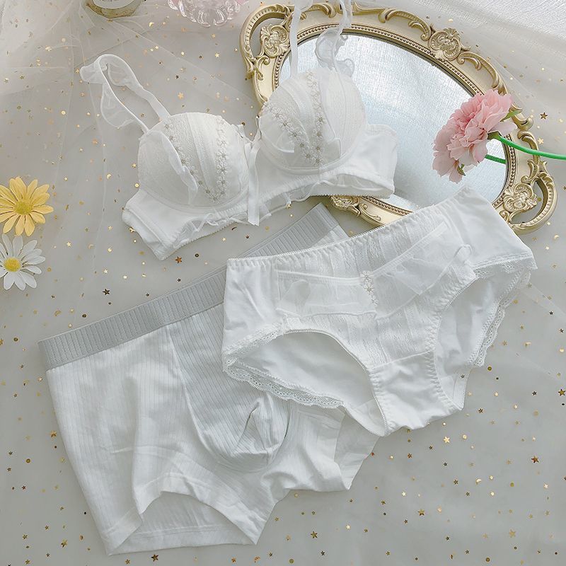 白いカップル下着スリーピーススーツブラジャーレースセクシーでキュートな純綿メンズパンツ付き