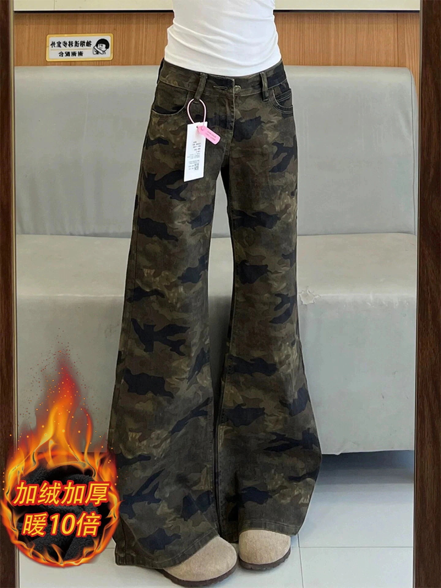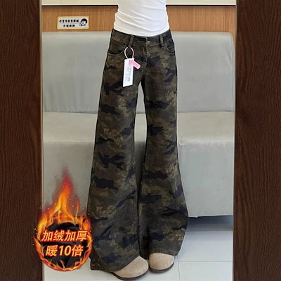 【秋冬増量裏起毛 レディース】カモフラージュデニムマイクロフレアパンツ ハイウエスト リラックスフィット ワイドレッグロングパンツ