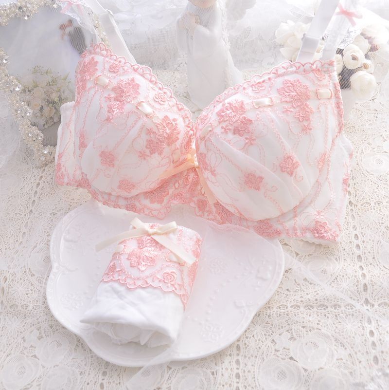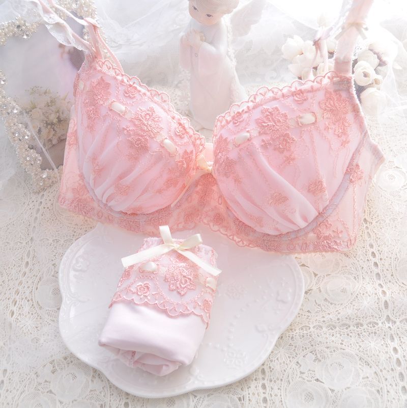 可愛いセット下着 新調したい!ナイトブラ 人気ブラジャー 日本の2色の刺繍の薄い10代の女の子のかわいいギャザーセクシーランジェリーブラセット 盛れるブラ