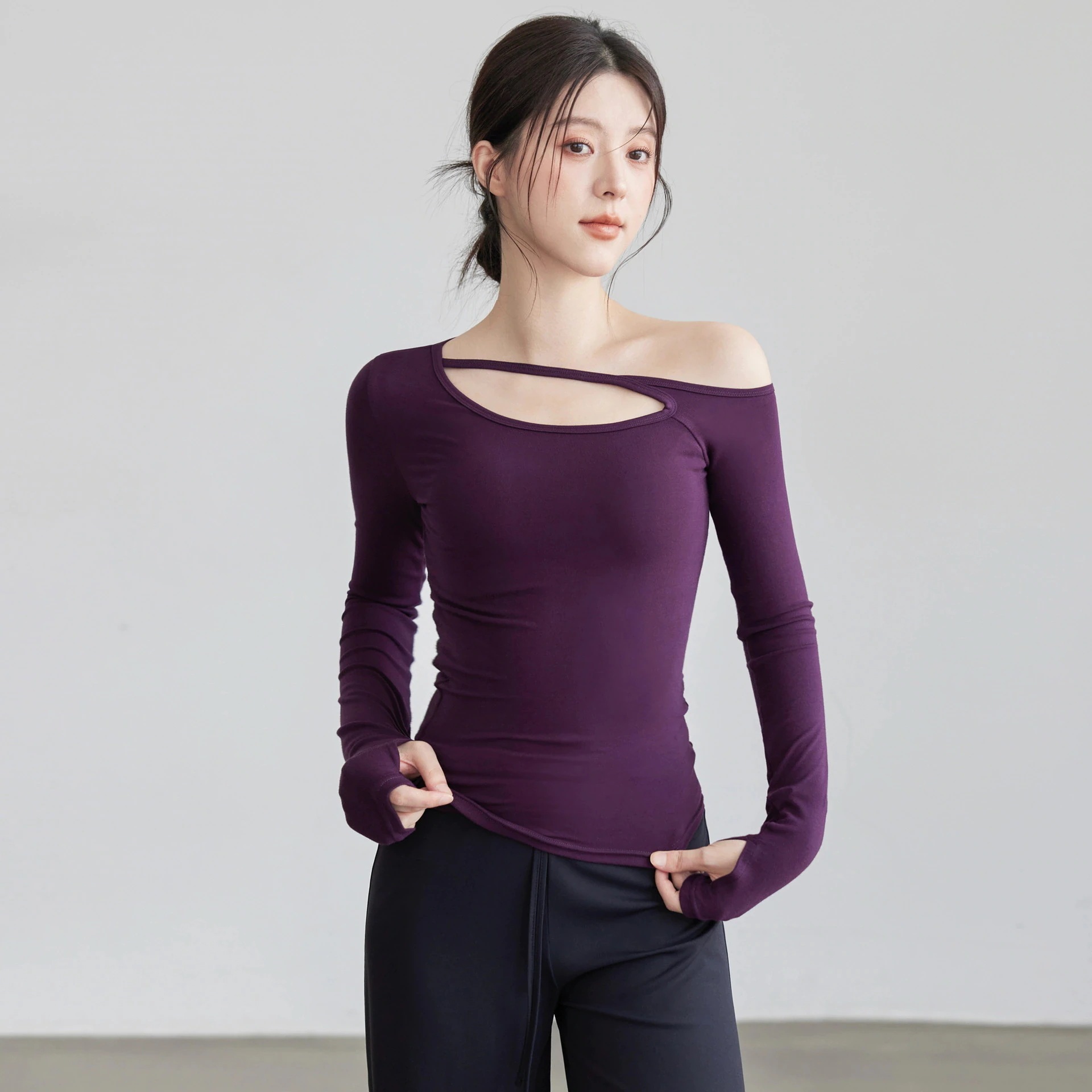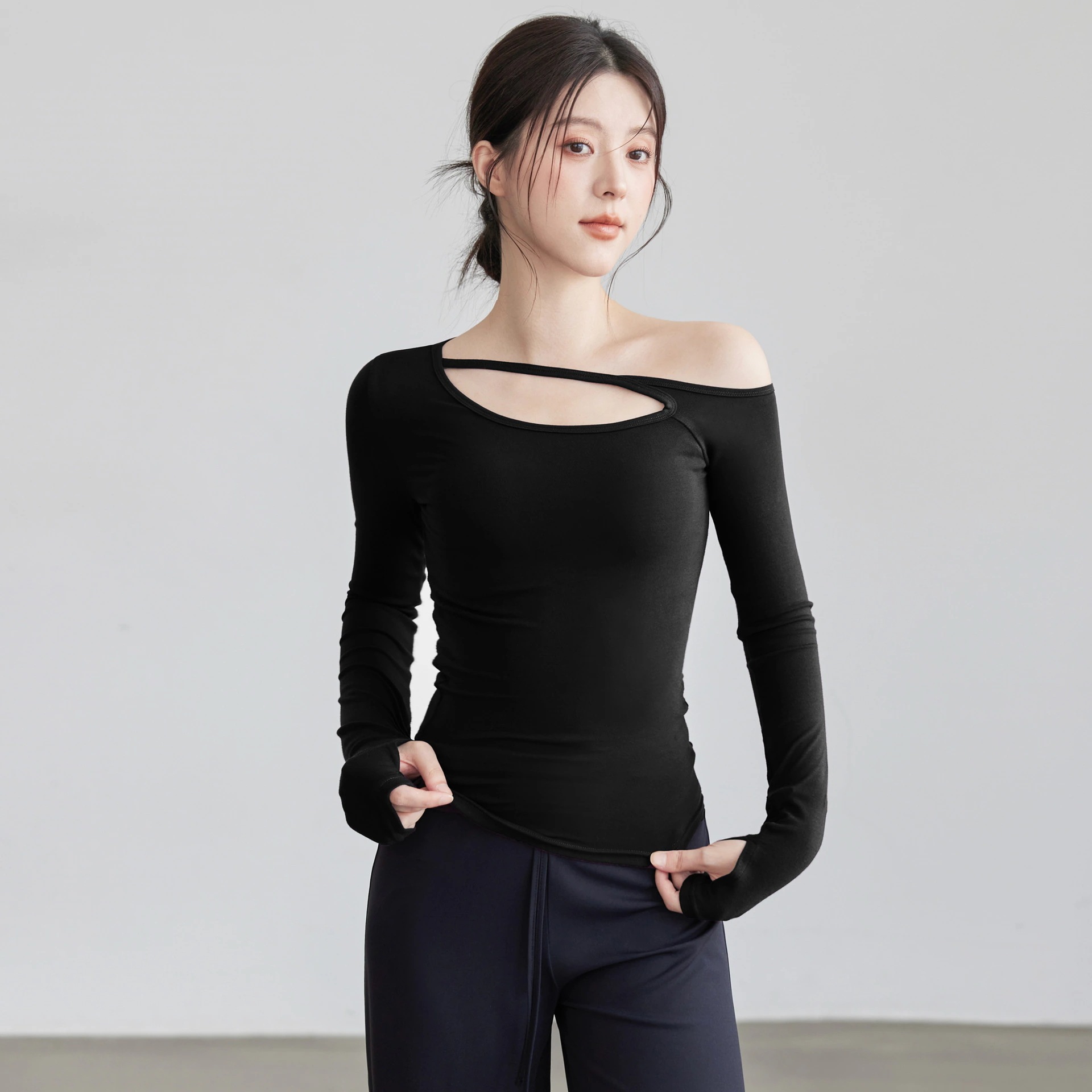 ヨガウェア女性レース長袖Tシャツ斜めネックインナーストラップトップス