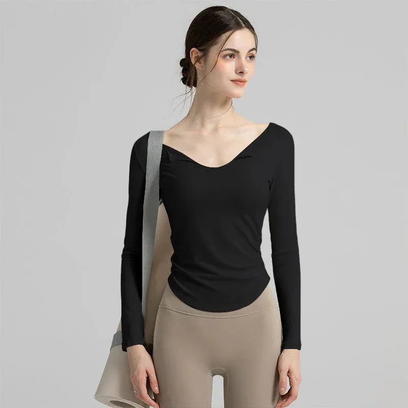 ヨガウェア女性用新作Vネック長袖スポーツTシャツ フィットウエストピラティスフィットネスウェアトップス