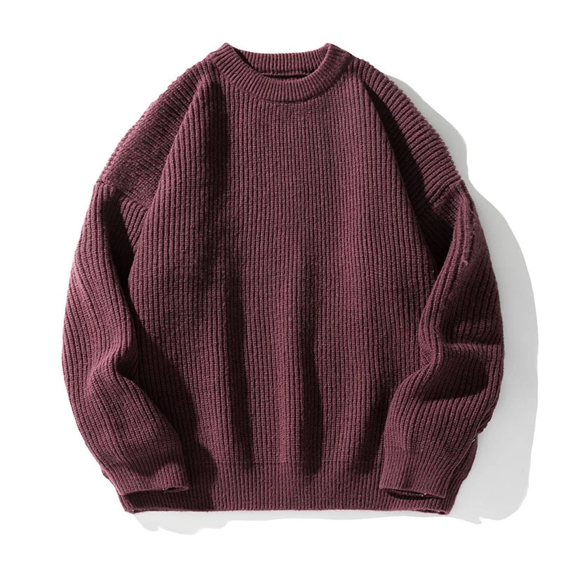 重厚な太針の穴あきストライプテクスチャーセーター 男性用秋冬ベーシック無地ルーズフィット丸首ニットトップスアウター・セーター