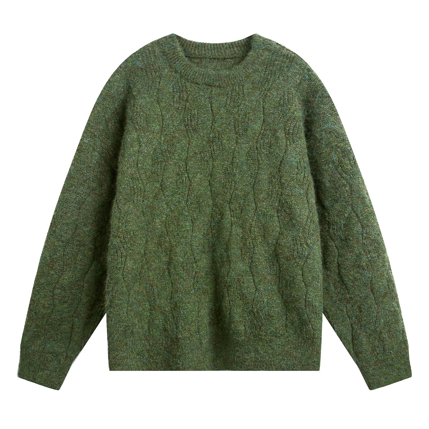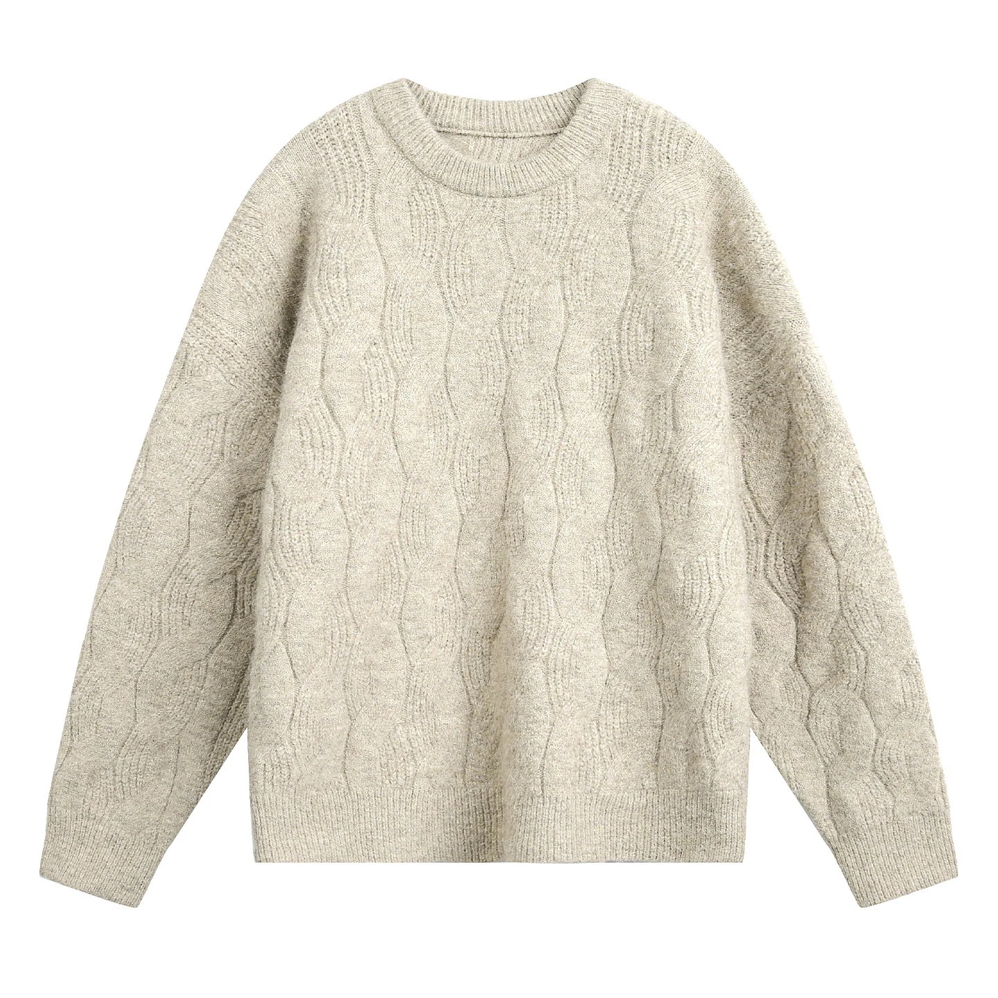 厚手質感の撚り編み無地ラウンドネックセーター(男性用) 秋冬向け 柔らかく肌触りの良いレトロ風ルーズフィットニットジャケット・セーター