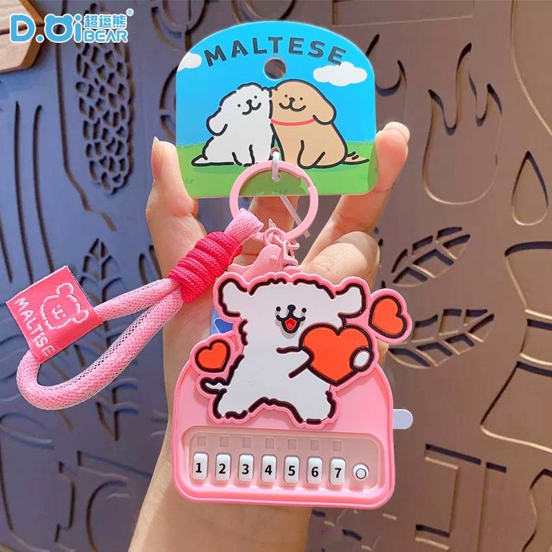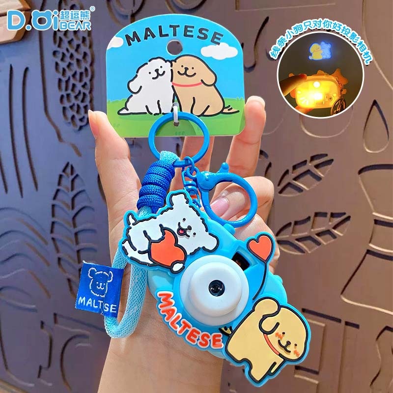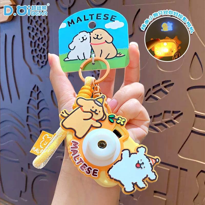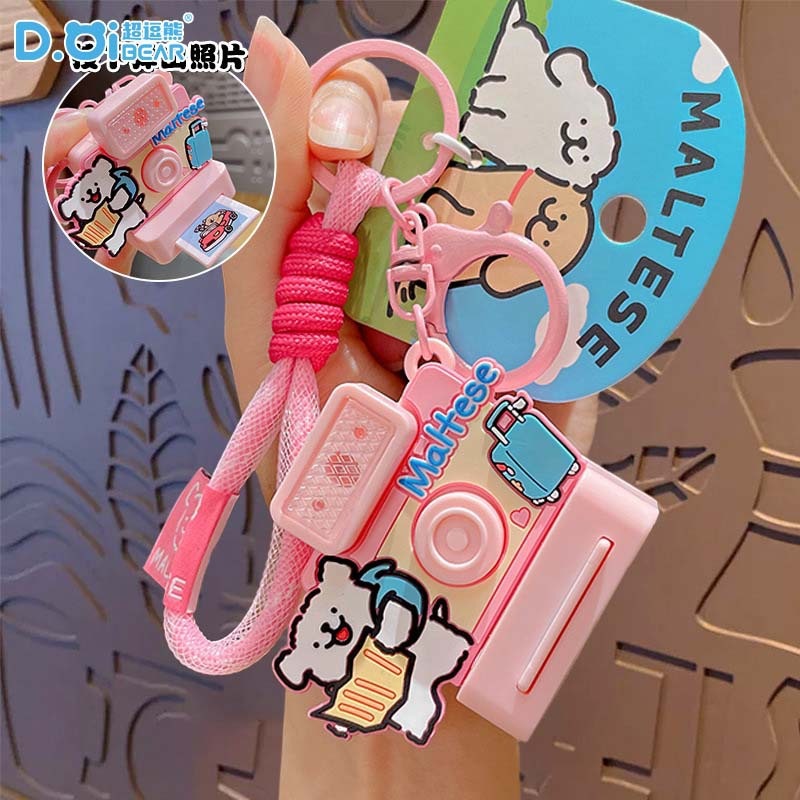 かわいいライン子犬はキーをたたいて旅行テーマアイデアカメラを掛けます