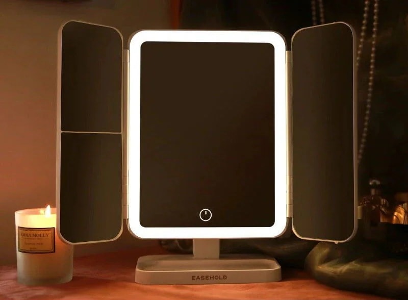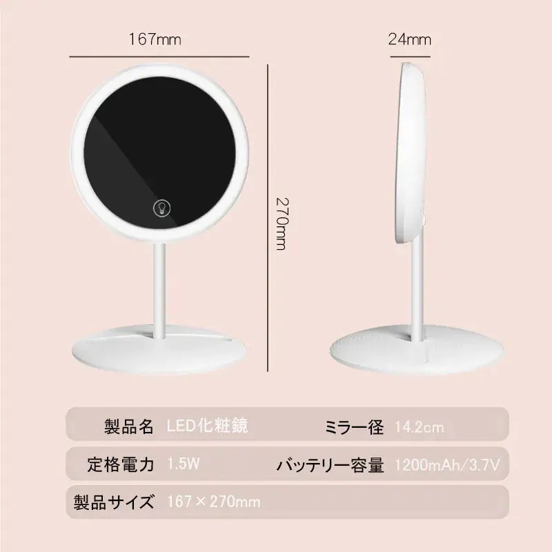 三面鏡三色LED菱型ステッチ 化粧鏡 明るさ調節 360度回転 プレゼント対応