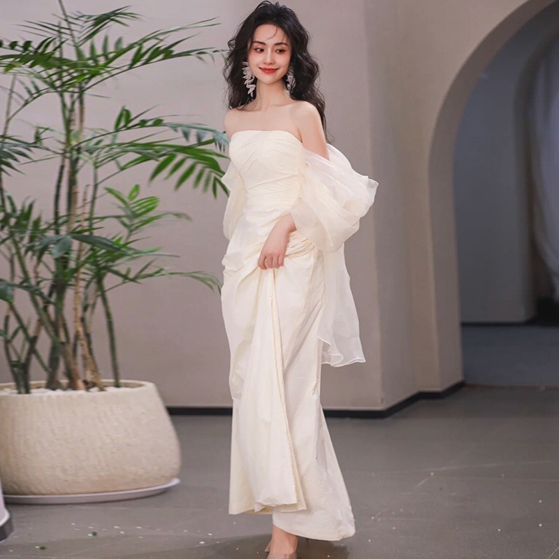 韓国 流行り ワンピース ドレス ストラップレスの軽やかなウェディングドレスシンプルでロング丈のサテン製フォーマルドレス