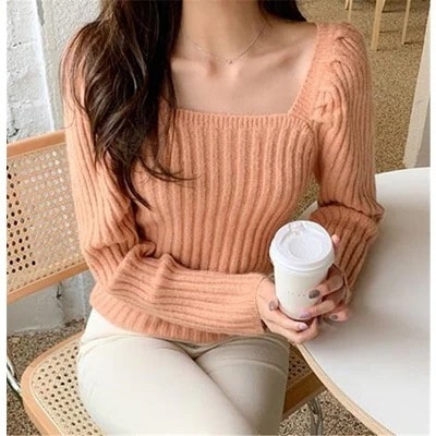 超お買い得タイムセール早い者勝ちファッションスリムフィットスクエアネック気質旅行気高い短いスタイルウールセーター鎖骨が出るsweet系暖かい学生上着