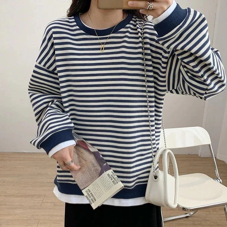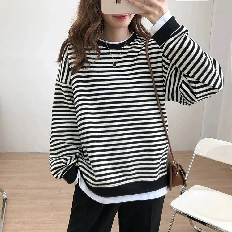 パーカー ゆったりスウェット スウェット あったかウェア偽2ストライプの衛衣女性長袖流ゆったりスリム丸首カバートップ