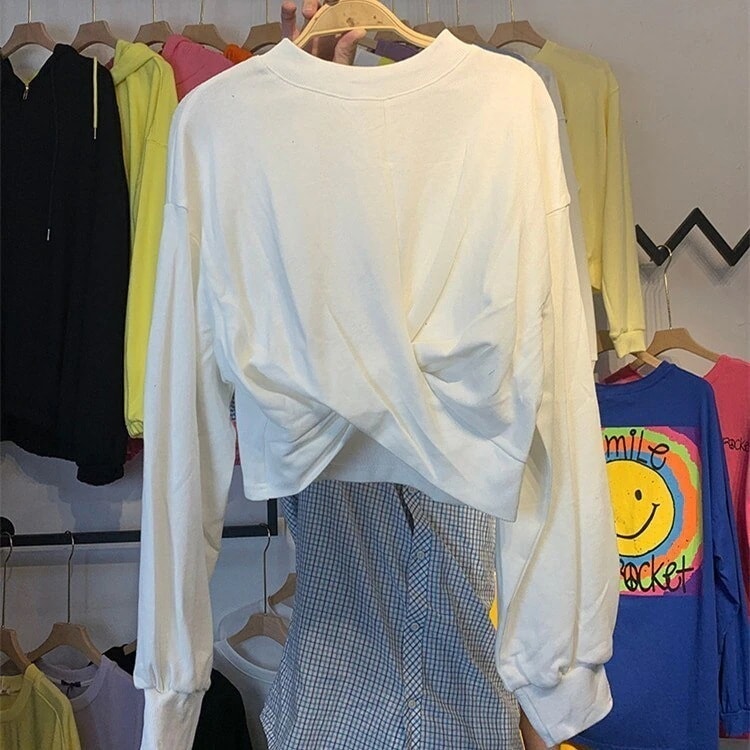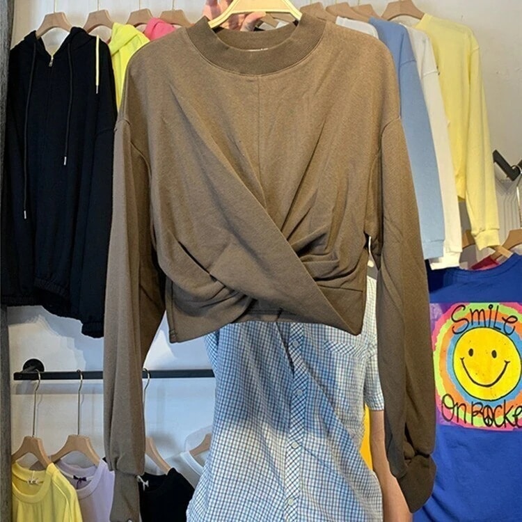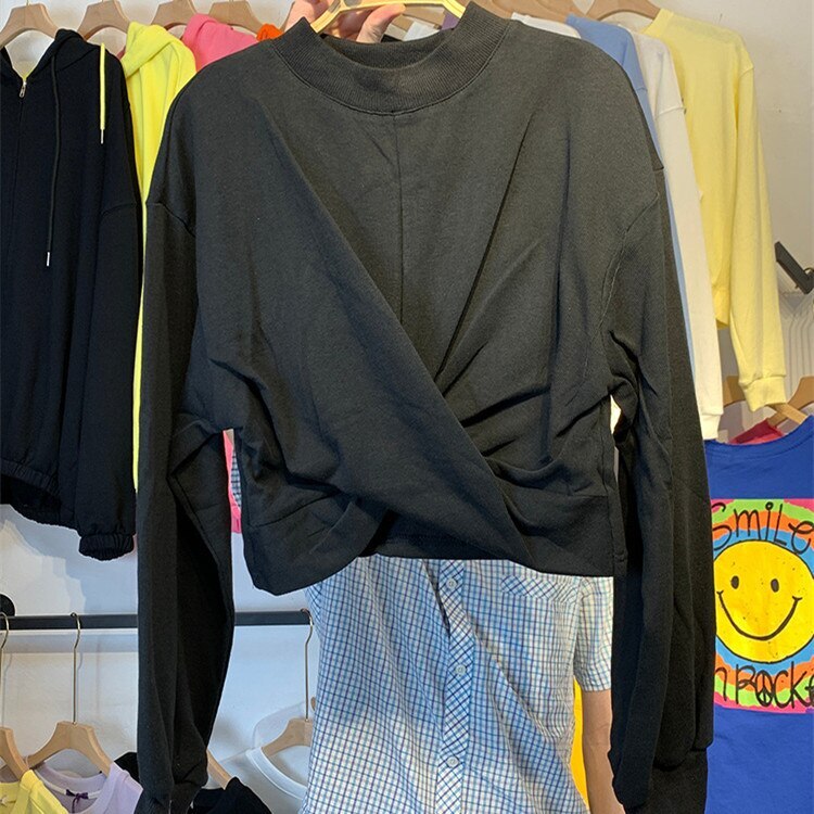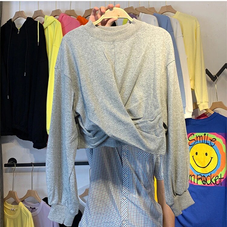 パーカー ゆったりスウェット 体型カバーチュニック 丸ネック 韓国ショット丈 イレギュラー シワ パーカーレイヤードトップスブラウス