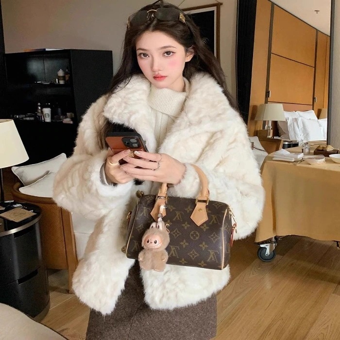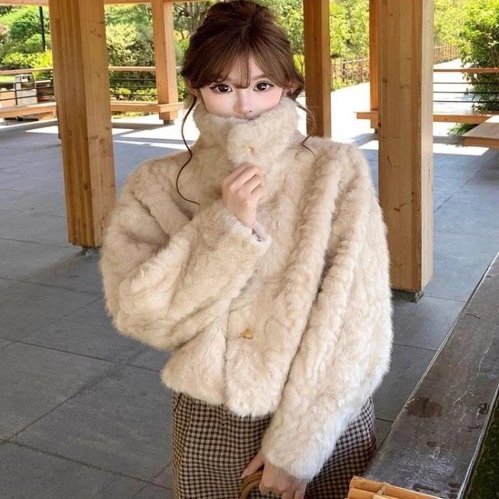 ハイネックショートファーコート レディース 2025年冬新作 低身長向け ゆったり厚手フリース一体型ファー