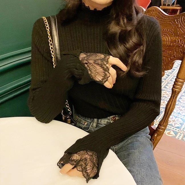 ニット 袖レース ハイネック トップス 長袖 レディース 重ね着風 フレア袖 レースニット カットソー リブニット フリルネック フィット ニットセーター 柔らかい 可愛い 着痩せ 体型カバー 秋冬