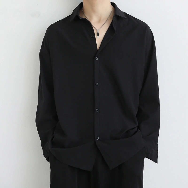 ゆったりアイスシルク垂れ感ブラックシャツ男性長袖 秋トレンドカジュアルメンズジャケット白シャツ長袖シャツ