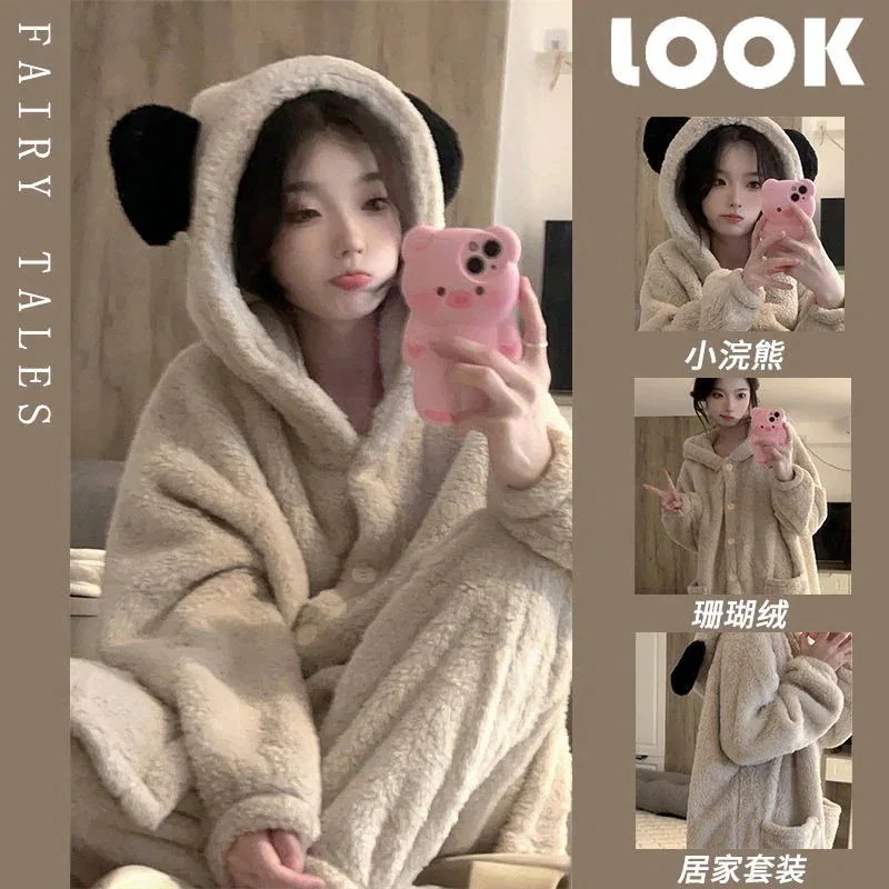 パジャマ レディース 着ぐるみ もこもこ クマフード付き サンゴフリース 中わた入り ローブ あったか かわいい 快適 保温 本日の商品