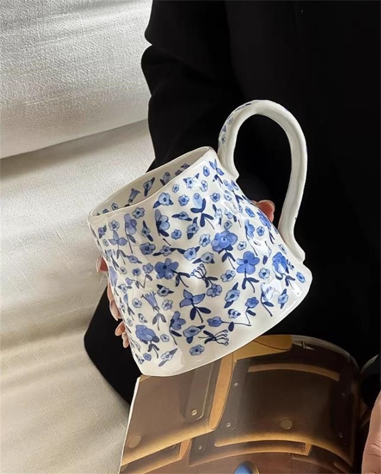 早い者勝ち 青い花柄が優雅な陶器製マグカップ 取っ手付きで使いやすく 600mlの大容量で毎朝のミルクやコーヒーを楽しめます アートな雰囲気とインスタ風デザインが2026年新作の魅力です