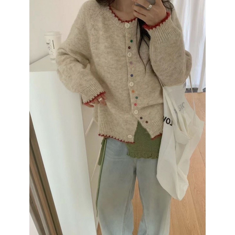 10個セット 韓国版カラーボタンぶつけ色モチモチニットカーディガン2026秋冬ゆったり痩せ丸首セーター女