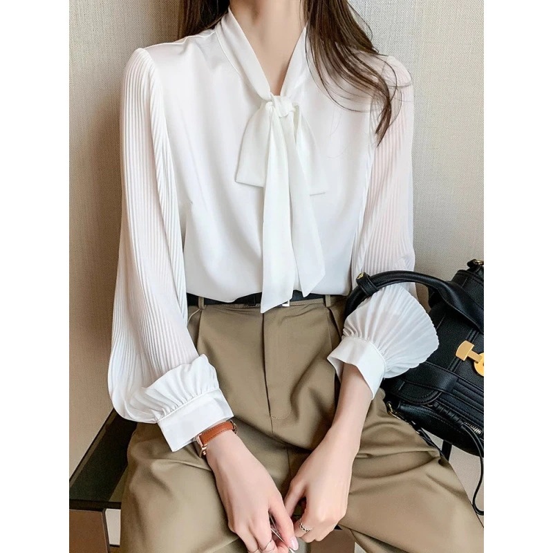 リボン付きビジネスウェア白シャツ女性用2025年春新作ふんわり襟付き長袖ゆったりおしゃれシフォンブラウス
