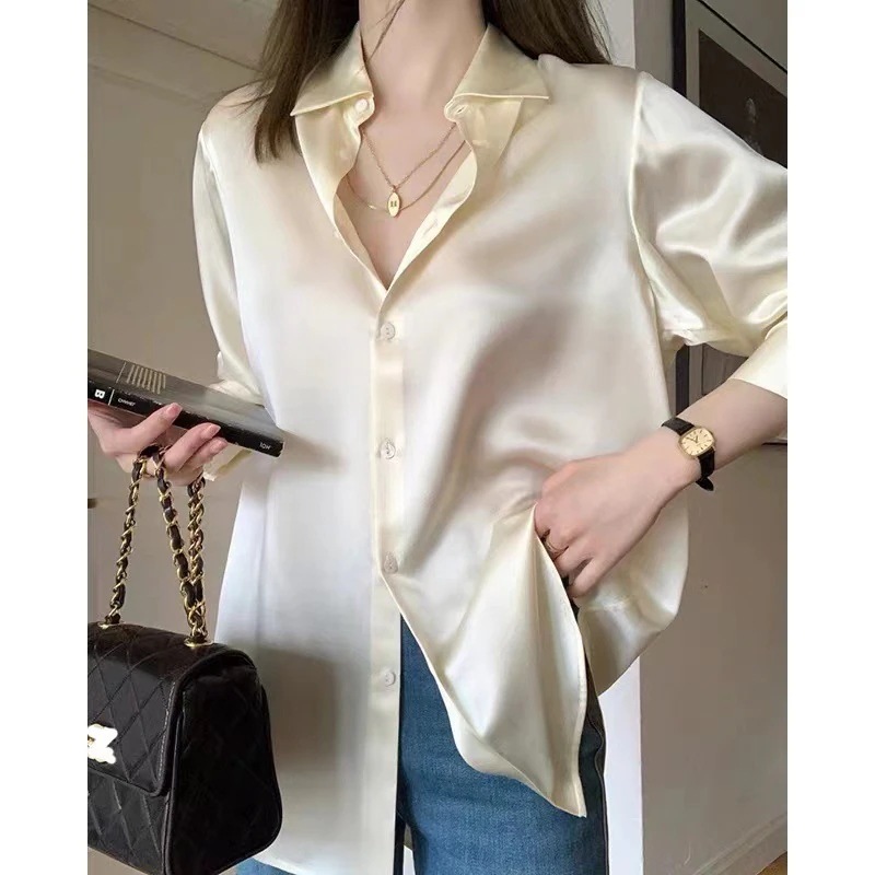 フレンチ風シルク調長袖シャツ女性用春秋用ブラウスニッチなインナー酢酸シルクサテン素材トップス