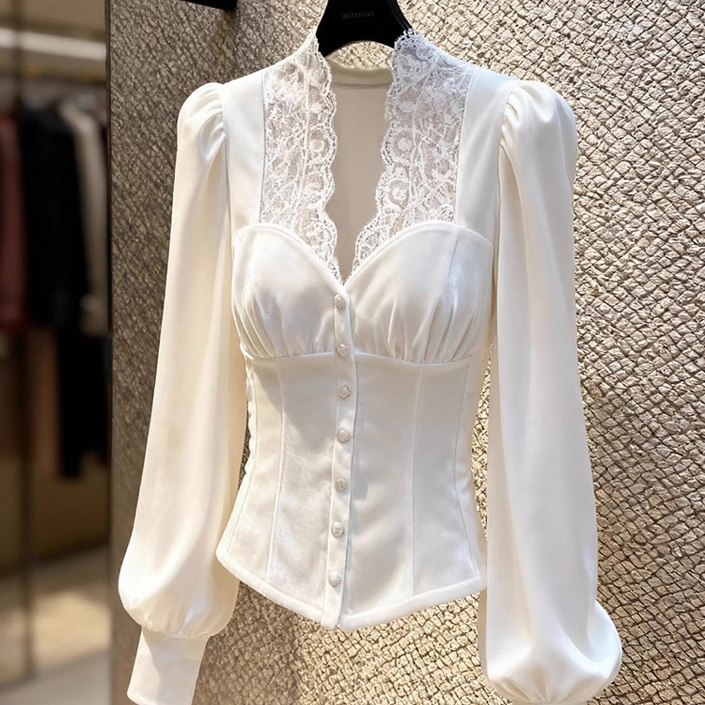 軽奢 白色レースVネック ベルベット長袖シャツ 女性用 2025年秋冬新作 スリムシルエット 細身効果トップス